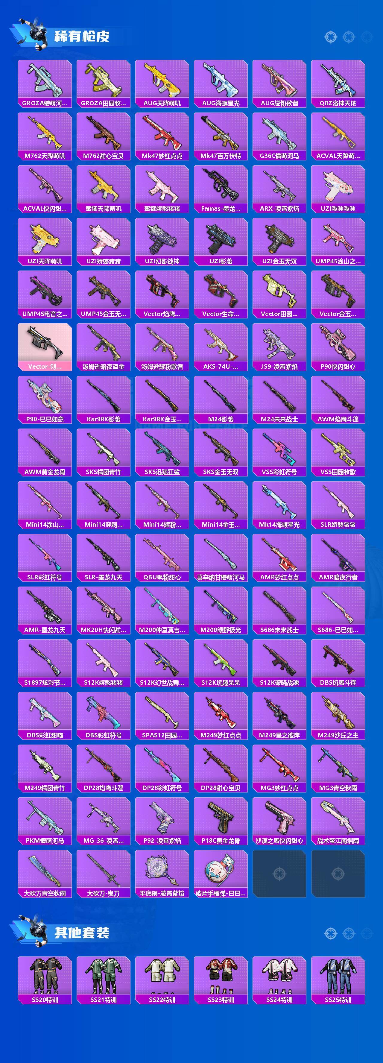 【稀有枪皮】:AKM-彩虹符号,AKM-影袭,AKM-星之信仰,AKM-春暖花开,AKM-江南烟雨,AKM-破晓战魂,AKM-缤纷海域,AKM-霓虹街区,AKM-龙的传人,SCAR-L-夜灯,SCAR-L-炫彩节奏,SCAR-L-玉兔迎春,SCAR-L-红色方程式,M416-彩虹嘻嘻猴,M416-糯团青竹,M416-红色方程式,M416-蓝色火焰,GROZA-影袭,GROZA-懵萌河马,GROZA-田园牧歌,AUG-天降萌叽,AUG-海螺星光,AUG-耀粉歌者,QBZ-洛神天依,M762-天降萌叽,M762-甜心宝贝,Mk47-妙红点
