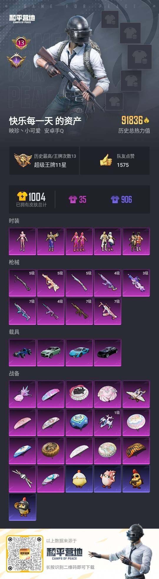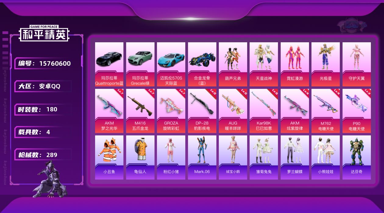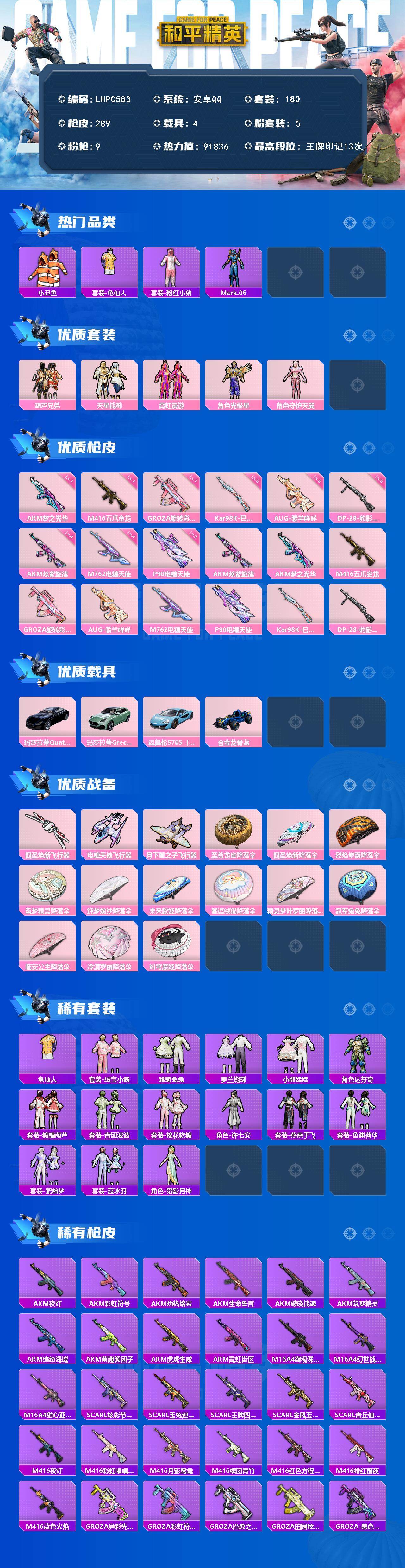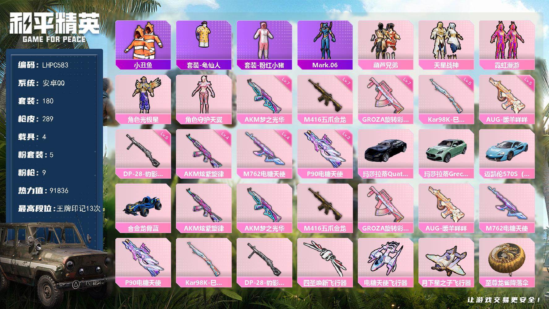 [15760600]【特价出售/店主推荐】安卓 手Q-5粉装-9特效枪-4载具-4粉色飞行器-91836热力值-13王牌印记-180套装-289枪皮 【热门品类】:套装-小丑鱼,套装-龟仙人,套装-粉红小猪,角色-Mark.06 【粉色套装】:粉装-葫芦兄弟,粉装-天星战神,粉装-霓虹漫游,角色-光极星,角色-守护天翼 【粉色枪皮等级】:AKM-炫紫旋律(四级),AKM-梦之光华(七级),M416-五爪金龙(七级),GROZA-旋转彩虹(七级),AUG-暖羊咩咩(五级),M762-电糖天使(四级),P90-电糖天使(三级),Kar98K-巳巳如意(五级),DP-28-豹影疾电(五级) 【粉色载具】:玛莎拉蒂Quattroporte(夜幕蓝),玛莎拉蒂Grecale(薄荷绿),迈凯伦570S(天际蓝),合金龙骨(蓝) 【粉色枪皮】:AKM-炫紫旋律,AKM-梦之光华,M416-五爪金龙,GROZA-旋转彩虹,AUG-暖羊咩咩,M762-电糖天使,P90-电糖天使,Kar98K-巳巳如意,DP-28-豹影疾电 【粉色飞行器】:四圣焕新飞行器,电糖天使飞行器,月下星之子飞行器 【粉色降落伞】:至尊龙雀降落伞,四圣焕新降落伞,烈焰拳霸降落伞,筑梦精灵降落伞,纯梦嫁纱降落伞,未来歌姬降落伞,蜜语绒猫降落伞,精灵梦叶罗丽降落伞,冠军兔兔降落伞,临安公主降落伞,冷漠罗丽降落伞,绯穹魔姬降落伞,炫彩糖果降落伞 【稀有套装】:套装-龟仙人,套装-绒宝小鹅,套装-雏菊兔兔,套装-萝兰蝴蝶,套装-小熊娃娃,角色-达芬奇,套装-糖糖葫芦,套装-青团波波,套装-棉花软糖,角色-许七安,套装-燕燕于飞,套装-鱼渊荷华,套装-紫幽梦,套装-蓝冰羽,角色-猎影月神,套装-炫彩糖果 【稀有枪皮】:AUG-冰晶雪宝,AKM-夜灯,AKM-彩虹符号,AKM-灼热熔岩,AKM-生命誓言,AKM-破晓战魂,AKM-筑梦精灵,AKM-缤纷海域,AKM-萌趣颜团子,AKM-虎虎生威,AKM-霓虹街区,M16A4-凝视深渊,M16A4-幻世战舞者,M16A4-甜心亚梦,SCAR-L-炫彩节奏,SCAR-L-玉兔迎春,SCAR-L-王牌四分卫,SCAR-L-金风玉露,SCAR-L-青丘仙客,M416-夜灯,M416-彩虹嘻嘻猴,M416-月影鸳鸯,M416-糯团青竹,M416-红色方程式,M416-绯红前夜,M416-蓝色火焰,GR