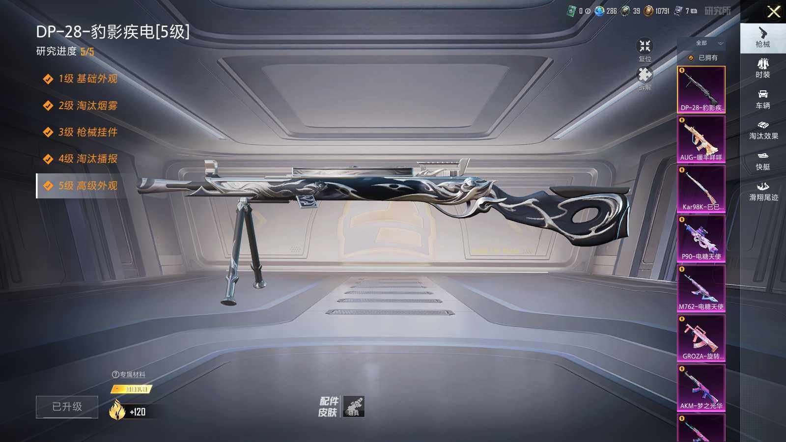 【粉色枪皮等级】:AKM-炫紫旋律(四级),AKM-梦之光华(七级),M416-五爪金龙(七级),GROZA-旋转彩虹(七级),AUG-暖羊咩咩(五级),M762-电糖天使(四级),P90-电糖天使(三级),Kar98K-巳巳如意(五级),DP-28-豹影疾电(五级)