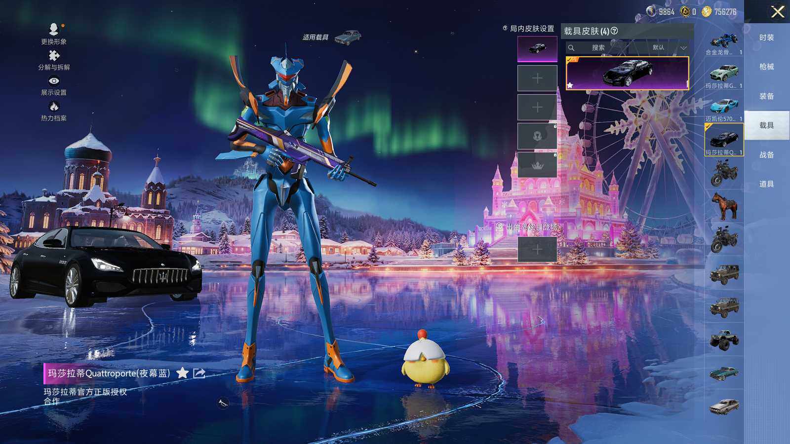 【粉色载具】:玛莎拉蒂Quattroporte(夜幕蓝),玛莎拉蒂Grecale(薄荷绿),迈凯伦570S(天际蓝),合金龙骨(蓝)