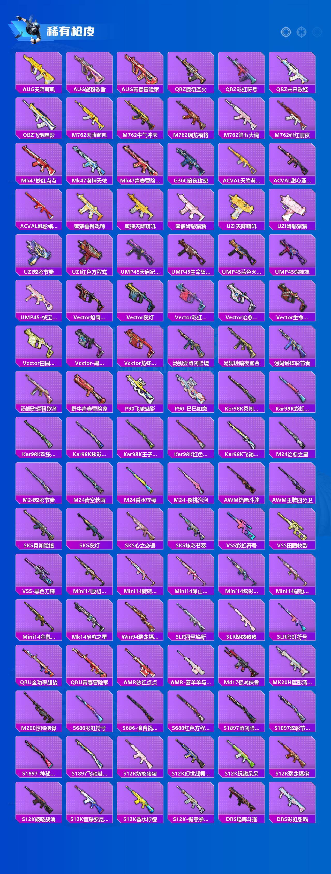 【稀有枪皮】:AUG-冰晶雪宝,AKM-夜灯,AKM-彩虹符号,AKM-灼热熔岩,AKM-生命誓言,AKM-破晓战魂,AKM-筑梦精灵,AKM-缤纷海域,AKM-萌趣颜团子,AKM-虎虎生威,AKM-霓虹街区,M16A4-凝视深渊,M16A4-幻世战舞者,M16A4-甜心亚梦,SCAR-L-炫彩节奏,SCAR-L-玉兔迎春,SCAR-L-王牌四分卫,SCAR-L-金风玉露,SCAR-L-青丘仙客,M416-夜灯,M416-彩虹嘻嘻猴,M416-月影鸳鸯,M416-糯团青竹,M416-红色方程式,M416-绯红前夜,M416-蓝色火焰,GR