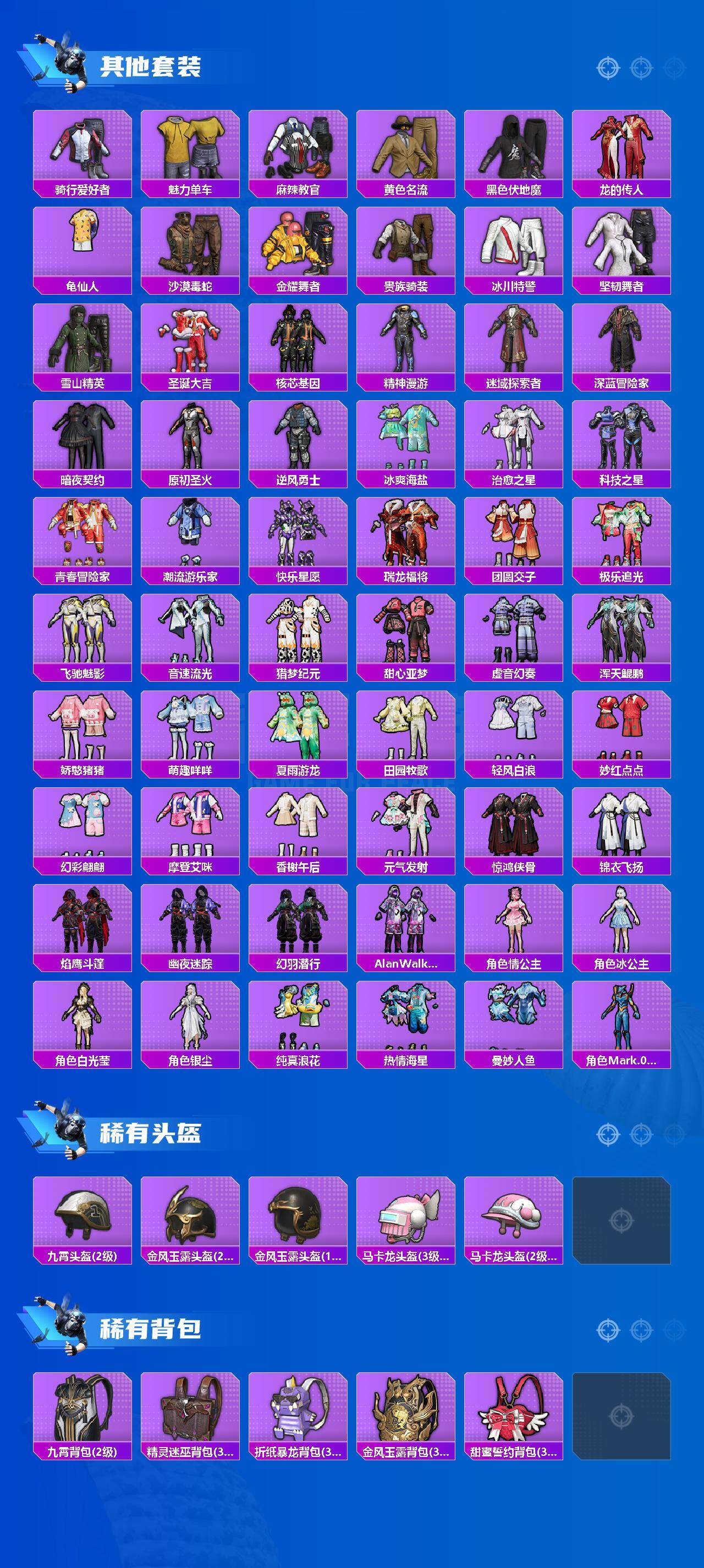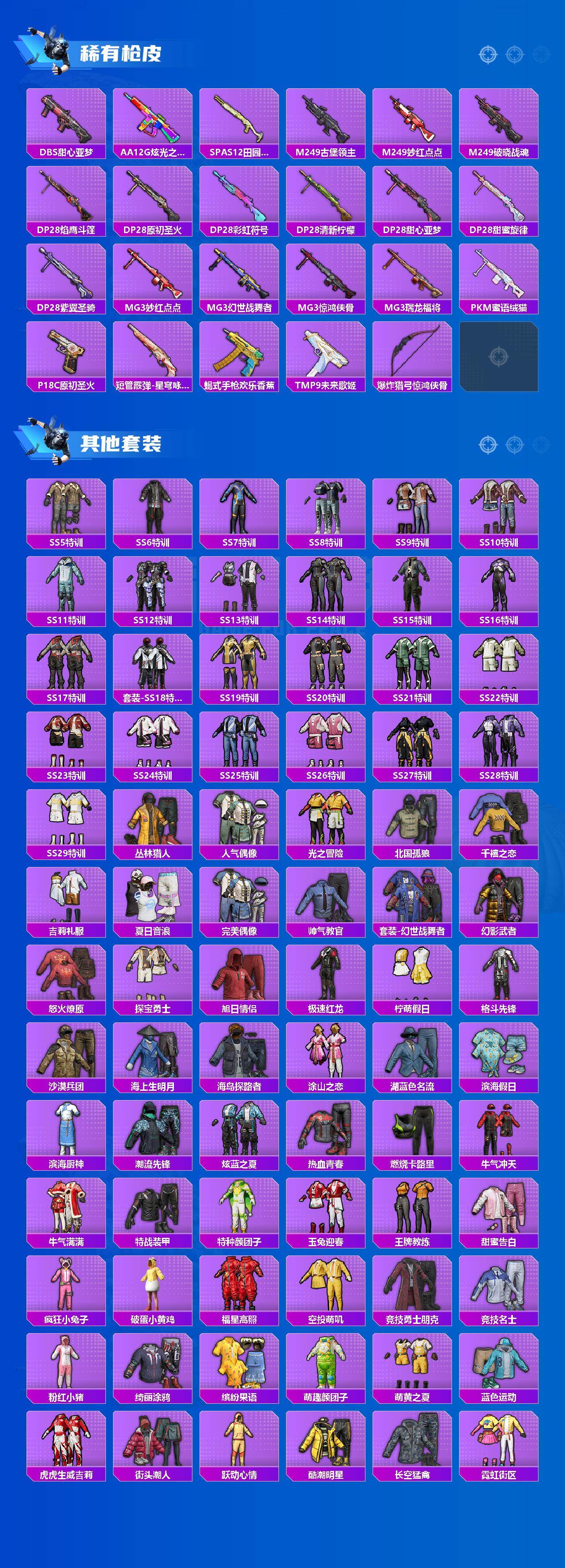 - [11525613]4粉装 5特效枪 5印记 可二次 可修改实名 身法装备:暗影哥特(红眼罩) 优质装备:M416五爪金龙,未来战士,SCAR-L青春物语,AKM绿萝繁花,七级SCAR-L-青春物语,Kar98K-巳巳如意 热门装扮:碧影闪光,射星猎手,圣堂之誓,兔兔白日梦,鹰眼刺客,梦魇先生,深海小丑鱼 稀有枪皮:DP-28-豹影疾电 六级特效枪:六级M416-五爪金龙 五级特效枪:五级Kar98K-巳巳如意,五级AKM-绿萝繁花 四级特效枪:四级DP-28-豹影疾电 紫色装扮:田园牧歌,轻风白浪,和煦暖阳,SS22特训,SS23特训,幻彩翩翩,妙红点点,娇憨猪猪,酸甜橘柚,夏雨游龙,萌趣咩咩,SS21特训,熠彩粉晶,SS31特训套装,冰川特警,冷焰舞者,SS30特训套装,SS33特训套装,青涩时光,SS20特训,暗夜傀儡,艾克斯奥特曼,时空追击者,暴风机械师,龙宫之主,遗落祭司,飞驰魅影,音速流光,SS19特训,军刀雅典娜,英勇保护者,甜心亚梦,虚音幻奏,瑞龙福将,团圆交子,SS17特训,异彩先驱,缤纷焰火,SS18特训,水晶王族,智慧隐士,酷潮明星,野性战心,长空猛禽,雪鹰学院,霓虹极客,霓虹街区,青年教官,边境牛仔,风暴特警,缤纷果语,耀眼新星,蓝色运动,虎虎生威吉莉,街头潮人,西部牛仔,飞行日记,魅力单车,鹤鸣,麻辣教官,黄色名流,黄色运动,黑色伏地魔,龙的传人,龟仙人,冰河战士,龙魂突击队,蝶变,熔岩游骑兵连帽夹克,极地朋克,柠萌假日,格斗先锋,沙漠兵团,深蓝色名流,清新柠檬,滨海假日,幻影武者,夏日音浪,幻世战舞者,探宝勇士,滨海厨神,绮丽涂鸦,甜蜜菠萝,白色伏地魔,破晓战魂,福星高照,空岛之星,空投萌叽,竞技达人朋克,王牌教练,牛气冲天,炫蓝之夏,牛气满满,猛禽,特战英豪,狂沙舞者,SS29特训,星途旅人,SS28特训,铁血战翼,鱼渊荷华,玉兔迎春,燕燕于飞,巳巳如意,阿奴,竞技名士,暗影哥特(红眼罩),许七安,惊鸿侠骨,神气柴柴,懵萌河马,SS24特训(SS24特训套装),SS25特训,锦衣飞扬,超人强,焰鹰斗篷,幻羽潜行,SS27特训,Alan Walker,浪漫天命,SS26特训,春光漫游,快闪甜心,贝斯之夜,智谋强哥,精神漫游,大橘大利,星渊小夜曲,森林猎手,SS32特训服(SS32特训套装),绯格组合,萌黄之夏,恋语绒绒,漫步者,金耀舞者,蓝调潮人,贵族骑装