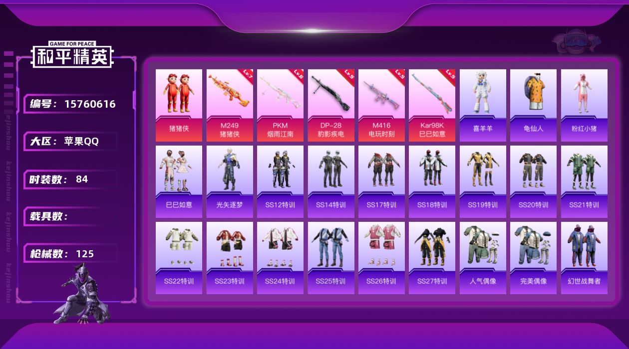 [15760616]可二次【特价出售/店主推荐】苹果 手Q-1粉装-5特效枪-0载具-1粉色飞行器-35482热力值-9王牌印记-84套装-125枪皮 【热门品类】:套装-龟仙人,套装-粉红小猪 【粉色套装】:玩偶服-猪猪侠 【粉色枪皮等级】:M416-电玩时刻(五级),Kar98K-巳巳如意(五级),M249-猪猪侠(七级),DP-28-豹影疾电(五级),PKM-江南烟雨(六级) 【粉色枪皮】:M416-电玩时刻,Kar98K-巳巳如意,M249-猪猪侠,DP-28-豹影疾电,PKM-江南烟雨 【粉色降落伞】:闲梦青缨降落伞,猪猪侠降落伞,金丰海韵降落伞,极意拳锋降落伞,炫彩糖果降落伞 【稀有套装】:套装-龟仙人,套装-巳巳如意,角色-光矢逐梦,玩偶服-喜羊羊,套装-炫彩糖果 【稀有枪皮】:AKM-夜灯,AKM-彩虹符号,AKM-灼热熔岩,AKM-虎虎生威,AKM-霓虹街区,AKM-龙的传人,AKM-玄冥寒域,M16A4-幻世战舞者,M16A4-红色方程式,SCAR-L-炫彩节奏,SCAR-L-玉兔迎春,SCAR-L-黄金龙骨,M416-糯团青竹,M416-红色方程式,M416-蓝色火焰,GROZA-田园牧歌,AUG-海螺星光,AUG-耀粉歌者,QBZ-彩虹符号,M762-天降萌叽,M762-牛气冲天,M762-瑞龙福将,Mk47-洛神天依,AC-VAL-天降萌叽,AC-VAL-彩虹甜喵,蜜獾-垂柳戏鸭,蜜獾-天降萌叽,蜜獾-娇憨猪猪,UZI-啾咪啾咪,UZI-天降萌叽,UZI-娇憨猪猪,UZI-红色方程式,UMP45-夜灯,UMP45-猪猪侠,UMP45-蓝色火焰,Vector-焰鹰斗篷,Vector-彩虹符号,Vector-生命誓言,Vector-田园牧歌,汤姆逊-炫彩节奏,P90-巳巳如意,Kar98K-红色方程式,AWM-焰鹰斗篷,SKS-炫彩节奏,VSS-彩虹符号,VSS-田园牧歌,Mini14-海渊国主,Mk14-猪猪侠,Win94-瑞龙福将,SLR-娇憨猪猪,M417-猪猪侠,S686-生命誓言,S686-红色方程式,S1897-炫彩节奏,S12K-瑞龙福将,S12K-龙宫之主,S12K-垂柳戏鸭,S12K-娇憨猪猪,S12K-幻世战舞者,DBS-焰鹰斗篷,AA12-G-炫光之旅,SPAS-12-田园牧歌,M249-糯团青竹,DP-28-焰鹰斗篷,DP-28-彩虹符号
