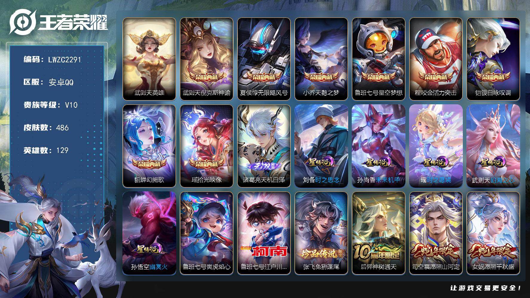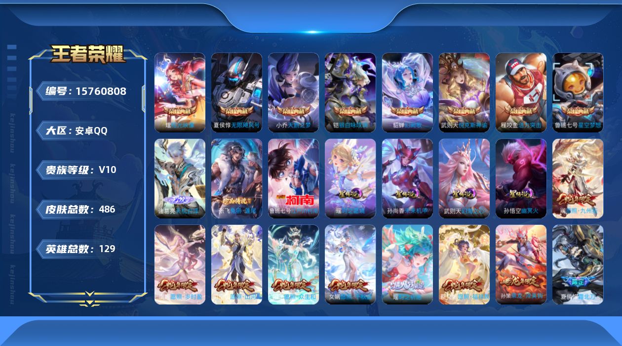 [15760808]【特价急出/详情看图】安卓Q-V10-至尊星耀IV段位-129英雄-486皮肤-8典藏皮肤-1典藏英雄-1无双-2珍品传说-6星元-48传说-154史诗