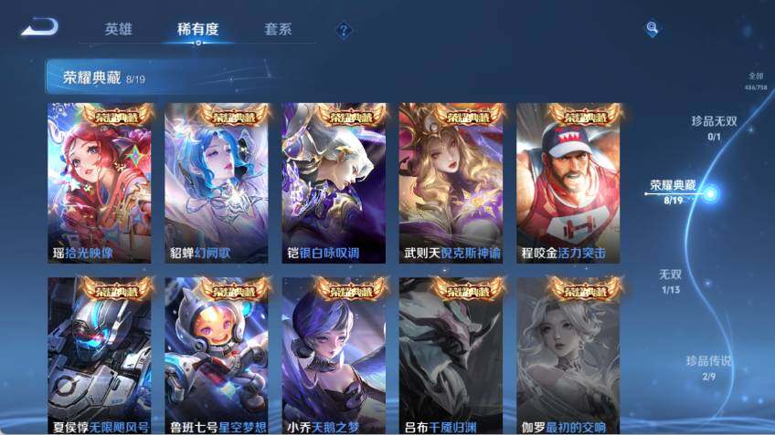 【荣耀典藏】:武则天英雄,武则天倪克斯神谕,夏侯惇无限飓风号,小乔天鹅之梦,鲁班七号星空梦想,程咬金活力突击,铠银白咏叹调,貂蝉幻阙歌,瑶拾光映像