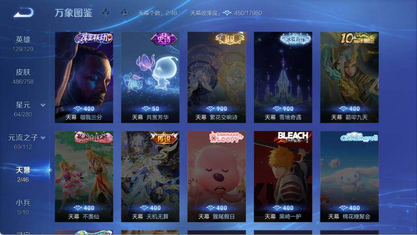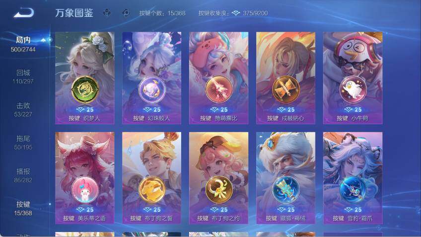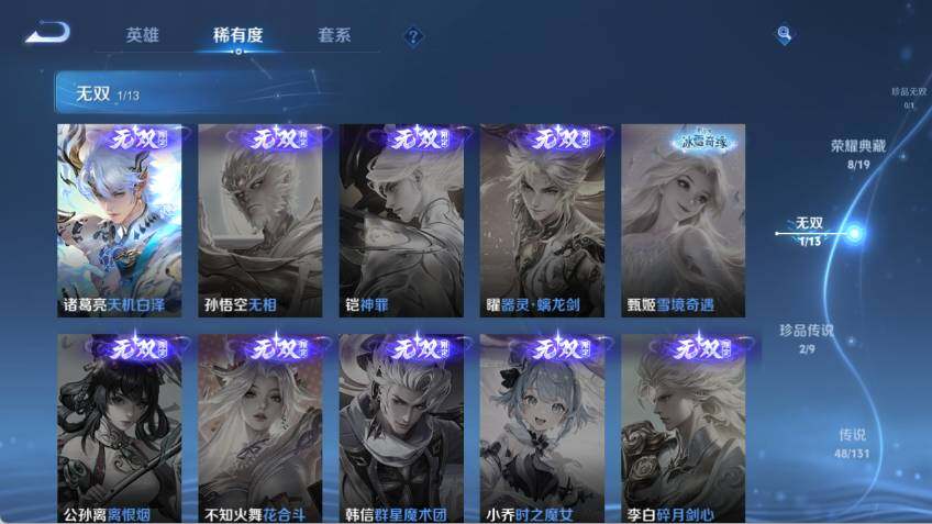 关羽冰锋战神,裴擒虎李小龙,牛魔奔雷神使,孙膑天狼运算者,王昭君凤凰于飞,花木兰默契交锋,兰陵王默契交锋,孙悟空至尊宝,干将莫邪冰霜恋舞曲,猪八戒猪悟能,孙悟空孙行者,鲁班七号寅虎·瑞焰,瑶时之祈愿,夏侯惇匿光决锋者,妲己时之奇旅,墨子降魔,李白诗剑行,盘古冰霜神祇,西施至美·乘鲤谣,甄姬至美·化雀舞,夏侯惇霜北刀,桑启鸣野蒿,澜愿照·九州拓,蔡文姬愿照·福禄聚,虞姬愿照·岁时盈,司空震愿照·山河定,妲己愿照·众生和,女娲愿照·千秋盛