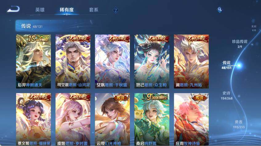 【传说皮肤】:后羿神树通天,司空震愿照山河定,女娲愿照千秋盛,妲己愿照众生和,澜愿照九州拓,蔡文姬愿照福禄聚,虞姬愿照岁时盈,云缨幻光神枪,桑启鸣野蒿,庄周牧神诗旅,夏侯惇霜北刀,典韦战鼓燎原,孙尚香乘龙问璇玑,孙策乘龙淬吴钩,赵云乘龙铭钟鼎,艾琳觅芳踪,甄姬至美化雀舞,东皇太一灼幽烈阳,亚瑟追逃游戏,安琪拉追逃游戏,张飞百相守梦,李白诗剑行,孙策末日机甲,瑶时之祈愿,鲁班七号寅虎瑞焰,赵云淬星耀世,王昭君乞巧织情,西施游龙清影,周瑜音你心动,小乔音你心动,李元芳飞鸢探春,兰陵王默契交锋,铠绛天战甲,镜炽阳神光,虞姬启明星使,曜云鹰飞将,李信一念神魔,刘备时之恋人,貂蝉猫影幻舞,张良黄金白羊座,干将莫邪久胜战神,虞姬云霓雀翎,花木兰冠军飞将,后羿黄金射手座,孙尚香末日机甲,宫本武藏地狱之眼,孙悟空地狱火,武则天海洋之心