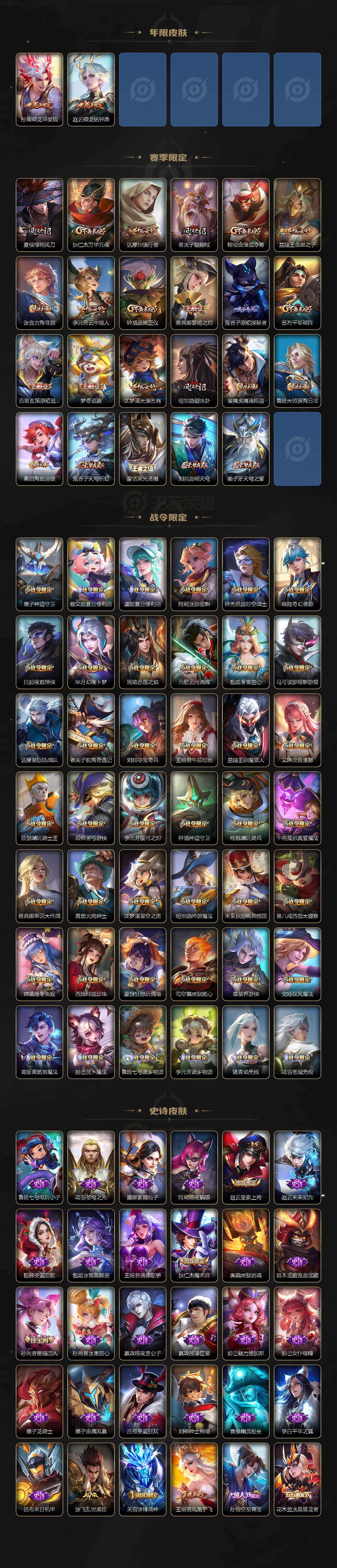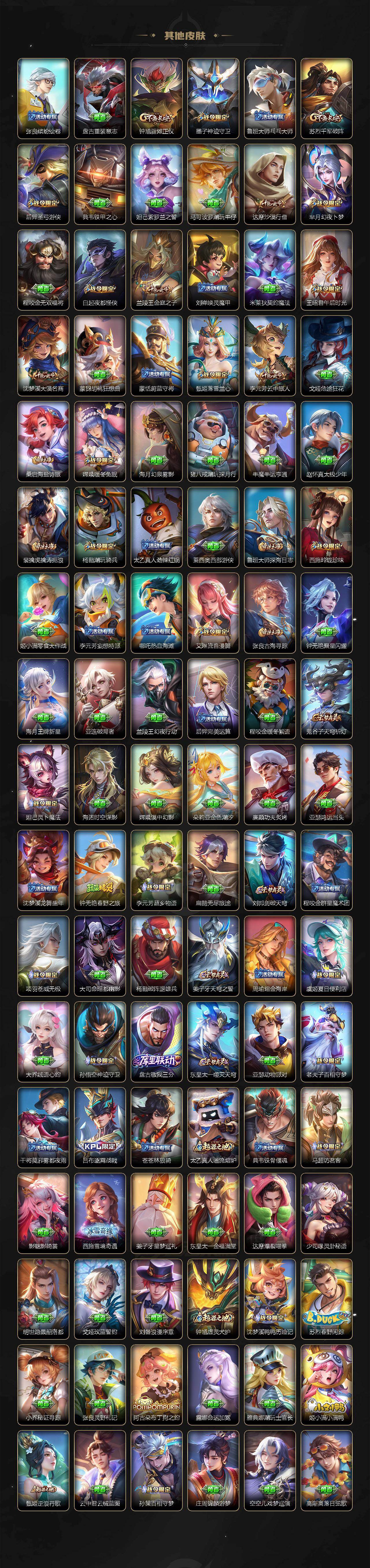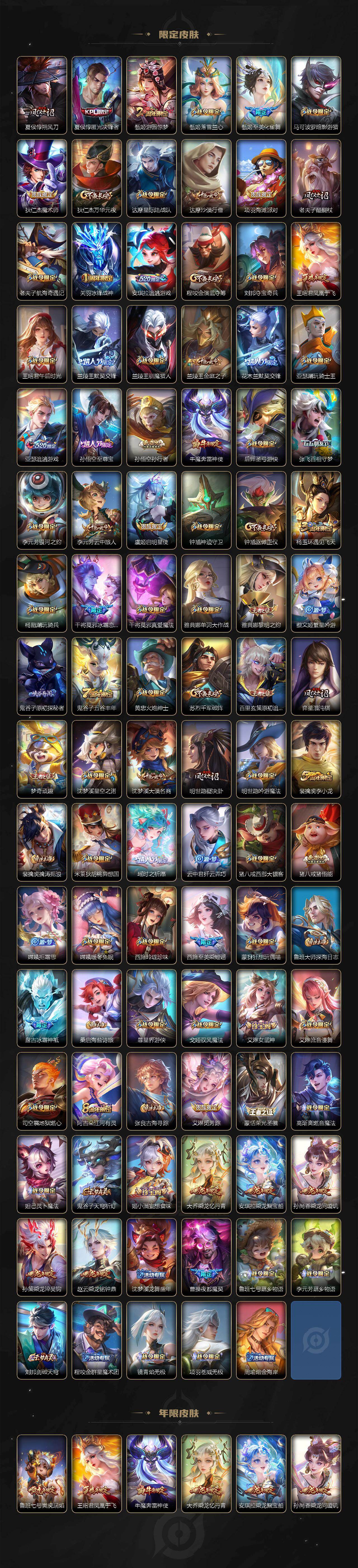 【限定皮肤】:夏侯惇霜北刀,蒙犽顽岩魄,蔡文姬夏日便利店,大乔绒语心约,虞姬夏日便利店,姜子牙天穹之誓,杨戬破阵退雄兵,狄仁杰阴阳师,赵云皇家上将,墨子神迹守卫,墨子降魔,妲己时之奇旅,孙尚香蔷薇恋人,鲁班七号寅虎瑞焰,庄周高山流水,高渐离玩趣恶龙,阿轲迷踪丽影,钟无艳超时空战士,孙膑天狼运算者,扁鹊奇幻香踪,白起夜都怪侠,芈月幻夜卜梦,周瑜赤莲之焰,元歌云间偶戏,夏侯惇朔风刀,夏侯惇匿光决锋者,甄姬游园惊梦,甄姬落雪兰心,甄姬至美化雀舞,马可波罗暗影游猎,狄仁杰魔术师,狄仁杰万华元夜,达摩星际陆战队,达摩沙漠行僧,项羽海滩派对,老夫子醍醐杖,老夫子航海奇遇记,关羽冰锋战神,安琪拉追逃游戏,程咬金演武夺筹,刘邦夺宝奇兵,王昭君凤凰于飞,王昭君午后时光,兰陵王默契交锋,兰陵王驯魔猎人,兰陵王金庭之子,花木兰默契交锋,亚瑟潮玩骑士王,亚