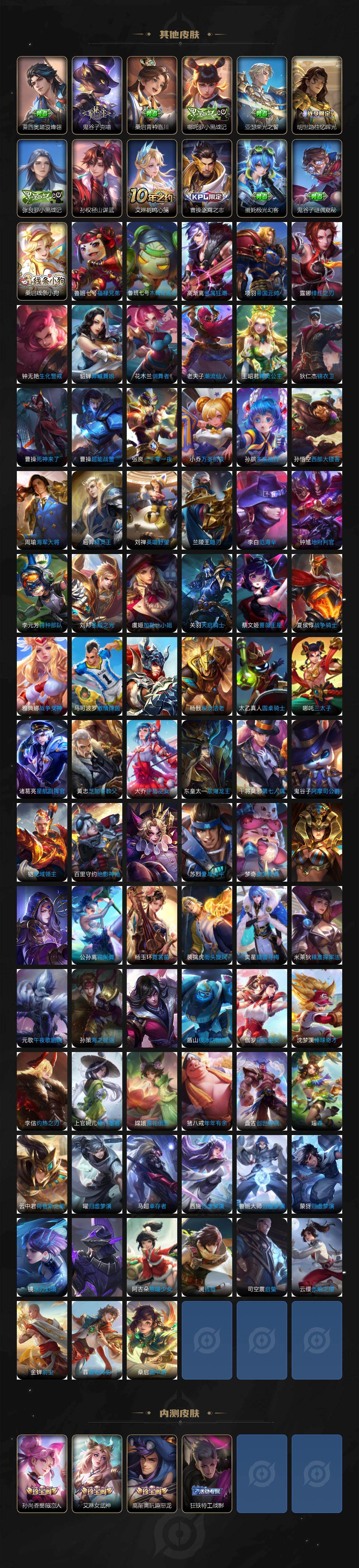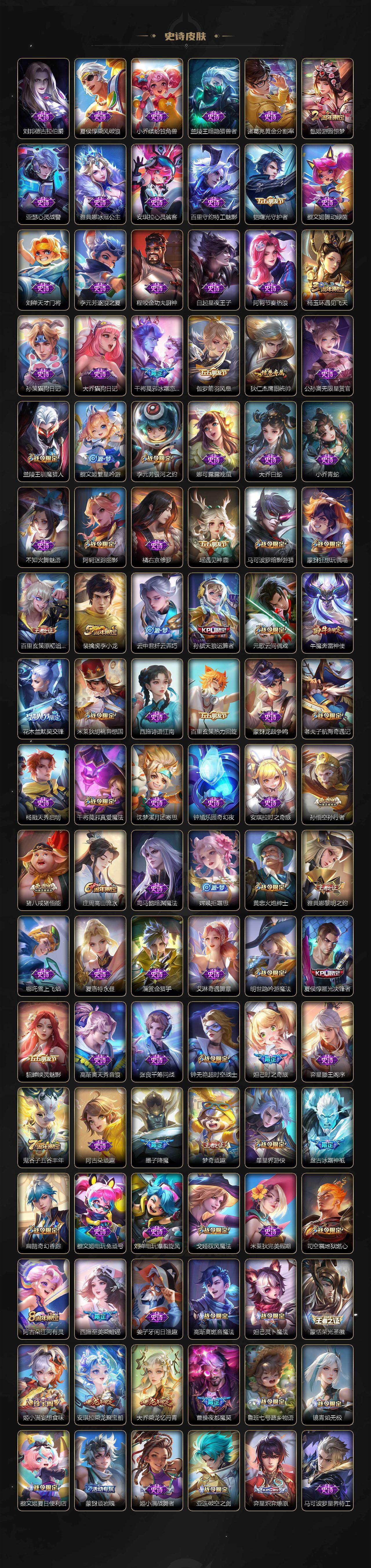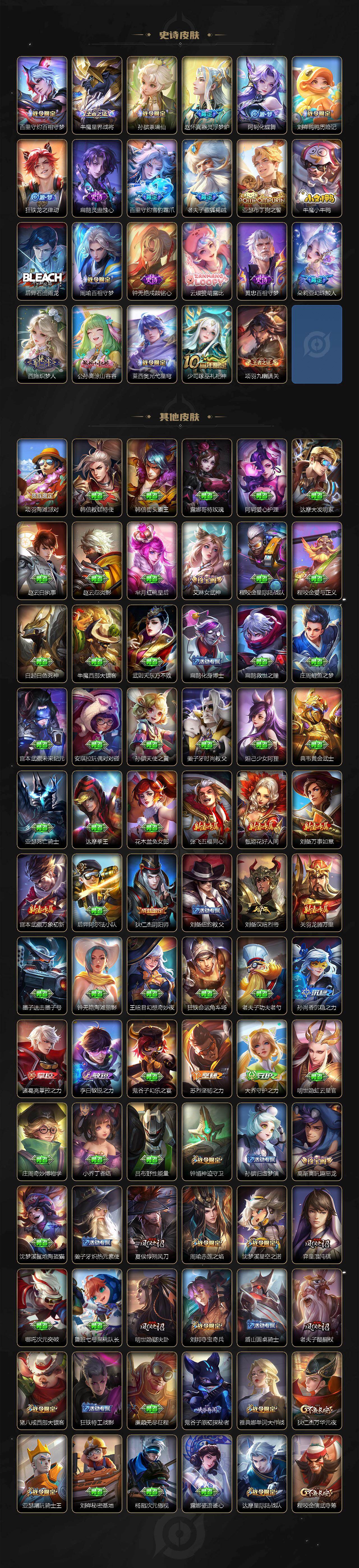 【限定皮肤】:夏侯惇霜北刀,蒙犽顽岩魄,蔡文姬夏日便利店,大乔绒语心约,虞姬夏日便利店,姜子牙天穹之誓,杨戬破阵退雄兵,狄仁杰阴阳师,赵云皇家上将,墨子神迹守卫,墨子降魔,妲己时之奇旅,孙尚香蔷薇恋人,鲁班七号寅虎瑞焰,庄周高山流水,高渐离玩趣恶龙,阿轲迷踪丽影,钟无艳超时空战士,孙膑天狼运算者,扁鹊奇幻香踪,白起夜都怪侠,芈月幻夜卜梦,周瑜赤莲之焰,元歌云间偶戏,夏侯惇朔风刀,夏侯惇匿光决锋者,甄姬游园惊梦,甄姬落雪兰心,甄姬至美化雀舞,马可波罗暗影游猎,狄仁杰魔术师,狄仁杰万华元夜,达摩星际陆战队,达摩沙漠行僧,项羽海滩派对,老夫子醍醐杖,老夫子航海奇遇记,关羽冰锋战神,安琪拉追逃游戏,程咬金演武夺筹,刘邦夺宝奇兵,王昭君凤凰于飞,王昭君午后时光,兰陵王默契交锋,兰陵王驯魔猎人,兰陵王金庭之子,花木兰默契交锋,亚瑟潮玩骑士王,亚