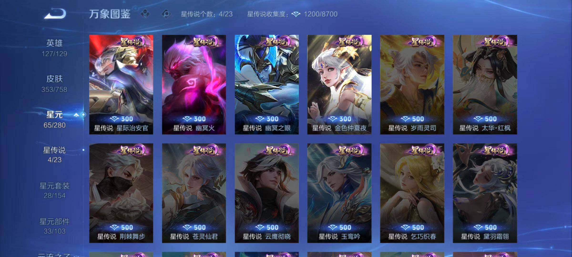 孙膑妖精王,虞姬凯尔特女王,白起狰,太乙真人饕餮,曹操烛龙,芈月重明,典韦穷奇,狂铁御狮,米莱狄御霄,牛魔御旌,盾山御銮,夏侯惇朔风刀,明世隐疑决卦,老夫子醍醐杖,鬼谷子原初探秘者,狄仁杰万华元夜,程咬金演武夺筹,钟馗驱傩正仪,苏烈千军破阵,吕布猎兽之王,嬴政白昼王子,女娲朔望之晖,典韦蓝屏警告,钟馗神迹守卫,鲁班七号狮舞东方,沈梦溪星空之诺,李元芳银河之约,马可波罗暗影游猎,蒙犽狂想玩偶喵,元歌云间偶戏,弈星混沌棋,达摩沙漠行僧,兰陵王金庭之子,沈梦溪大漠名商,李元芳云中旅人,桑启海盐诗旅,裴擒虎擒涛扼浪,鲁班大师探海日志,张良古海寻踪