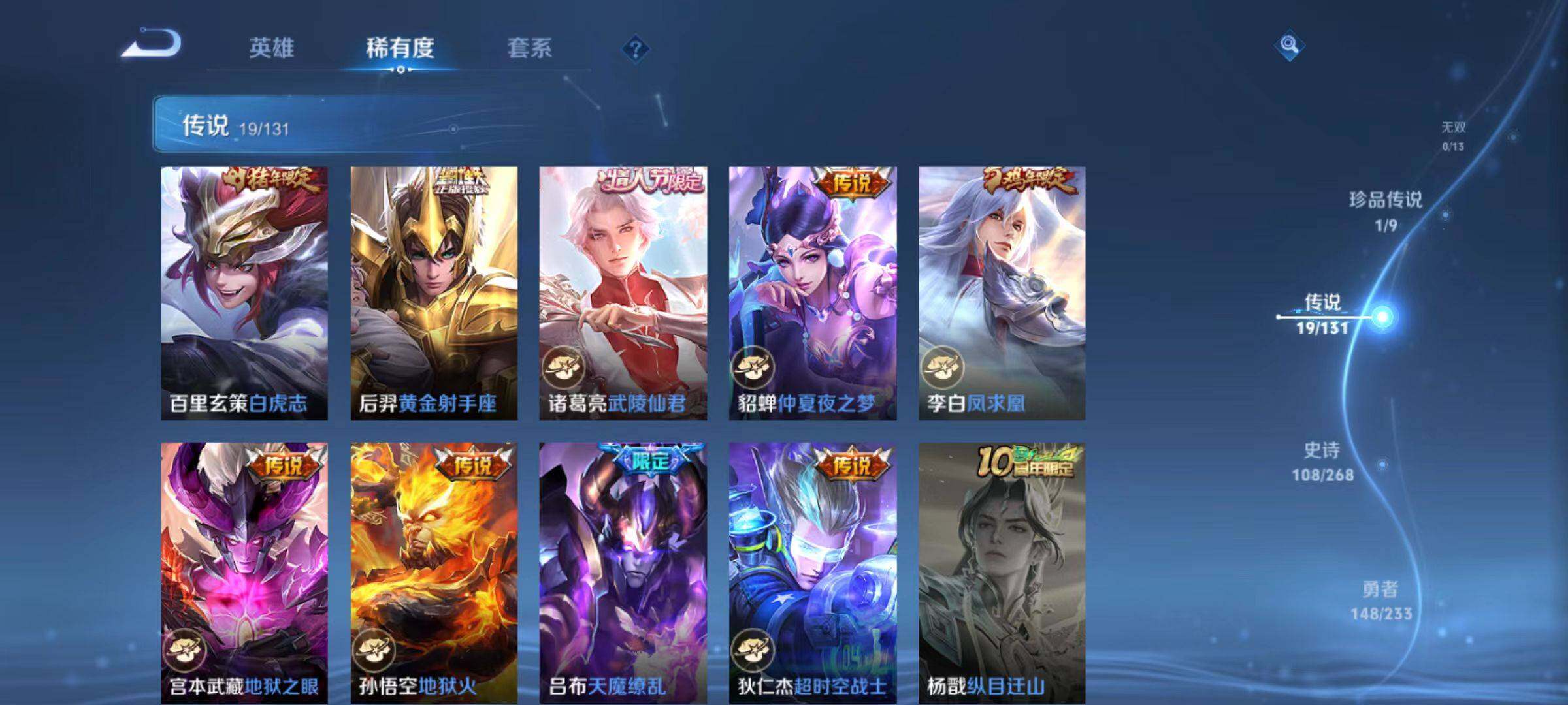 【传说皮肤】:后羿神树通天,曜李逍遥 ,虞姬启明星使,孙悟空零号赤焰,关羽武圣,李信一念神魔,张良黄金白羊座,干将莫邪久胜战神,虞姬云霓雀翎,达摩黄金狮子座,百里玄策白虎志,后羿黄金射手座,诸葛亮武陵仙君,貂蝉仲夏夜之梦,李白凤求凰,宫本武藏地狱之眼,孙悟空地狱火,吕布天魔缭乱,狄仁杰超时空战士