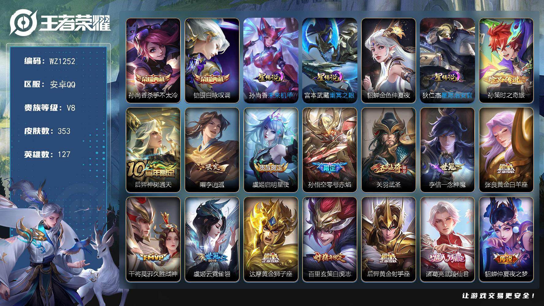 - [12089868]V8 1典藏 21传说 124英雄 273皮肤 可修改实名 优质装备:鸣剑·曳影,黄金狮子座,黄金射手座,冠军飞将,云鹰飞将(小将军),久胜战神,炽阳神光,一念神魔,云霓雀翎,末日机甲-孙尚香(绿蚂蚱),地狱火,仲夏夜之梦(大飞蛾),地狱之眼,超时空战士-狄仁杰,无双飞将,记忆之芯(机甲兔),琥珀纪元马超 传说皮:云诺千山 珍宝阁皮:女武神 限定皮:至尊宝,凤求凰(白切鸡),武陵仙君(小桃花),白晶晶,神威(电光马子),飞衡(韩信年限),遇见飞天,高山流水,五谷丰年,游园惊梦,梁祝,御风骁将(吕布年限),龙胆,烈魂,虎魄,天狼绘梦者,逐梦之影,朱雀志(守约年限),默契交锋-花木兰,深海之息(深海大菠萝) 史诗皮:化蝶舞,龙之律动,遇见神鹿,紫霞仙子,白龙吟,黄金分割率,特工魅影,千年之狐,永昼,魅语,无限星赏官,冰冠公主,偶像歌手,白蛇,末日机甲-吕布,猫狗日记-孙策,猫狗日记-大乔,时之恋人-孙尚香,乱世虎臣,节奏热浪,修罗,摇滚巨星,水果甜心,绅士熊喵,天才门将,星夜王子,心灵骇客,功夫厨神,德古拉伯爵,暗隐猎兽者,幽灵船长,鬼剑武藏,心灵战警,地狱岩魂,繁星吟游(呼啦呼啦),拒霜思,缤纷独角兽,乘风破浪,逐浪之夏,水晶猎龙者,曙光守护者,箭羽风息,金属风暴,原初追逐者,圣诞狂欢,圣诞恋歌,鹰眼统帅,暗夜贵公子,魅力维加斯,黎明之约,无心
