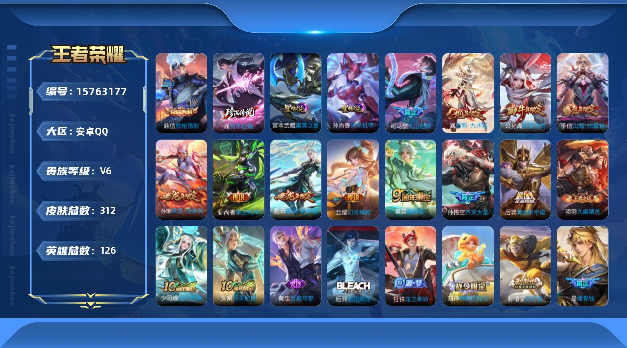 - [16330343]安卓Q-V7-至尊星耀IV段位-126英雄-203皮肤-1典藏皮肤-8传说-53史诗 【荣耀典藏】:韩信弑枪猎影 【传说皮肤】:澜愿照九州拓,云缨幻光神枪,桑启鸣野蒿,孙悟空齐天大圣,马超无双飞将,王昭君乞巧织情,铠绛天战甲,干将莫邪久胜战神 【限定皮肤】:大乔绒语心约,姜子牙天穹之誓,杨戬破阵退雄兵,狄仁杰阴阳师,赵云皇家上将,孙尚香蔷薇恋人,扁鹊奇幻香踪,元歌云间偶戏,马可波罗暗影游猎,马可波罗山海玄木吟,狄仁杰魔术师,项羽海滩派对,韩信飞衡,韩信傲雪梅枪,孙悟空齐天大圣,李元芳云中旅人,杨戬潮玩骑兵,干将莫邪胡桃夹子,百里玄策原初追逐者,裴擒虎擒涛扼浪,云中君纤云弄巧,上官婉儿梁祝,嫦娥拒霜思,嫦娥暖冬兔眠,西施玲珑珍味,鲁班大师探海日志,桑启海盐诗旅,暃星界游侠,戈娅驭风魔法,阿古朵江河有灵,张良古海寻踪,蒙犽百解令,高渐离燃音魔法,妲己灵卜魔法,鬼谷子天穹祈灯,沈梦溪龙舞盛年,刘邦剑破天穹,程咬金群星魔术团,项羽苍威无极,刘备异域游侠,周瑜熔金海岸 【年限皮肤】:韩信飞衡,马可波罗山海玄木吟 【赛季限定】:张良古海寻踪,李元芳云中旅人,百里玄策原初追逐者,裴擒虎擒涛扼浪,鲁班大师探海日志,桑启海盐诗旅,鬼谷子天穹祈灯,刘邦剑破天穹,姜子牙天穹之誓 【战令限定】:扁鹊奇幻香踪,元歌云间偶戏,马可波罗暗影游猎,杨戬潮玩骑兵,嫦娥暖冬兔眠,西施玲珑珍味,暃星界游侠,戈娅驭风魔法,高渐离燃音魔法,妲己灵卜魔法,项羽苍威无极 【史诗皮肤】:赵云皇家上将,貂蝉圣诞恋歌,甄姬冰雪圆舞曲,狄仁杰魔术师,宫本武藏鬼剑武藏,孙尚香蔷薇恋人,孙尚香水果甜心,嬴政暗夜贵公子,嬴政摇滚巨星,妲己魅力维加斯,妲己女仆咖啡,刘禅绅士熊喵,李白千年之狐,夏侯惇乘风破浪,小乔缤纷独角兽,亚瑟心灵战警,雅典娜冰冠公主,安琪拉心灵骇客,铠曙光守护者,刘禅天才门将,李元芳逐浪之夏,白起星夜王子,阿轲节奏热浪,孙策猫狗日记,大乔猫狗日记,伽罗箭羽风息,狄仁杰鹰眼统帅,上官婉儿梁祝,韩信飞衡,橘右京修罗,马可波罗暗影游猎,百里玄策原初追逐者,云中君纤云弄巧,元歌云间偶戏,嫦娥拒霜思,韩信傲雪梅枪,暃星界游侠,马可波罗山海玄木吟,扁鹊奇幻香踪,刘禅电玩爆裂旋风,戈娅驭风魔法,阿古朵江河有灵,蒙犽百解令,妲己灵卜魔法,高渐离燃音魔法,孙膑茶境仙,赵怀真器灵浮梦炉,阿轲化蝶舞,狂铁龙之律动,周瑜百相守梦