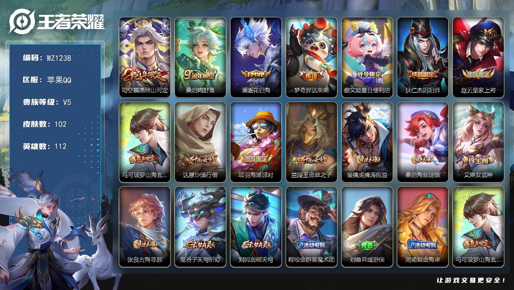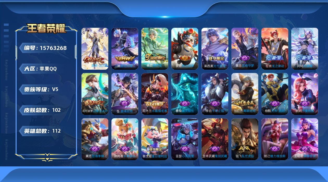 [15763268]苹果Q102皮肤-4传说-21史诗 【英雄全皮】:苍全皮 【传说皮肤】:司空震愿照山河定,桑启鸣野蒿,澜逐花归海,梦奇胖达荣荣 【限定皮肤】:蔡文姬夏日便利店,狄仁杰阴阳师,赵云皇家上将,马可波罗山海玄木吟,达摩沙漠行僧,项羽海滩派对,兰陵王金庭之子,裴擒虎擒涛扼浪,桑启海盐诗旅,艾琳女武神,张良古海寻踪,鬼谷子天穹祈灯,刘邦剑破天穹,程咬金群星魔术团,刘备异域游侠,周瑜熔金海岸 【年限皮肤】:马可波罗山海玄木吟 【赛季限定】:达摩沙漠行僧,兰陵王金庭之子,张良古海寻踪,裴擒虎擒涛扼浪,桑启海盐诗旅,鬼谷子天穹祈灯,刘邦剑破天穹 【战令限定】:蔡文姬夏日便利店 【史诗皮肤】:赵云皇家上将,王昭君偶像歌手,宫本武藏鬼剑武藏,孙尚香水果甜心,妲己魅力维加斯,曹操幽灵船长,李白千年之狐,张飞乱世虎臣,花木兰水晶猎龙者,亚瑟心灵战警,阿轲节奏热浪,狄仁杰鹰眼统帅,杨戬天秀启明,马可波罗山海玄木吟,黄忠怒海争锋,蔡文姬夏日便利店,苍狼魂孤将,阿轲化蝶舞,狂铁龙之律动,黄忠百相守梦,莱西奥光弋星穹 【其他皮肤】:项羽海滩派对,韩信教廷特使,韩信街头霸王,艾琳女武神,白起白色死神,牛魔西部大镖客,孙膑天使之翼,姜子牙时尚教父,亚瑟死亡骑士,达摩拳王,花木兰兔女郎,刘备万事如意,狄仁杰阴阳师,刘备纽约教父,刘备汉昭烈帝,狂铁命运角斗场,孙尚香沉稳之力,李白敏锐之力,苏烈坚韧之力,沈梦溪鲨炮海盗猫,鲁班大师乓乓大师,达摩沙漠行僧,兰陵王金庭之子,蒙恬蔚蓝守将,戈娅危途狂花,桑启海盐诗旅,海月幻泉雾影,牛魔牛运亨通,裴擒虎擒涛扼浪,太乙真人劲辣红锅,李元芳妄想特派,张良古海寻踪,后羿完美运算,鬼谷子天穹祈灯,海诺时空谍影,刘邦剑破天穹,程咬金群星魔术团,刘备异域游侠,周瑜熔金海岸,盘古敬我三分,东皇太一噬灭天穹,干将莫邪雾都夜雨,苍苍林狼骑,太乙真人谧流熔炉,典韦铁骨偃魂,西施雪境奇遇,姜子牙星梦巡礼,达摩爆裂喵拳,明世隐景韶洛都,戈娅玫蓝誓约,刘备浪漫序章,钟馗虚灵犬护,苏烈春野闲踪,张良灵野札记,亚瑟荣光之誓,明世隐往忆晖光,艾琳鹤鸣心笺,蚩奼极光幻客,露娜绯红之刃,孙悟空西部大镖客,夏侯惇战争骑士,马可波罗激情绿茵,苍维京掠夺者,诸葛亮星航指挥官,黄忠芝加哥教父,百里守约绝影神枪,公孙离花间舞,司马懿魇语军师,李信灼热之刃,盘古创世神祝,云中君荷鲁斯之眼,马超幸存者,澜孤猎,司
