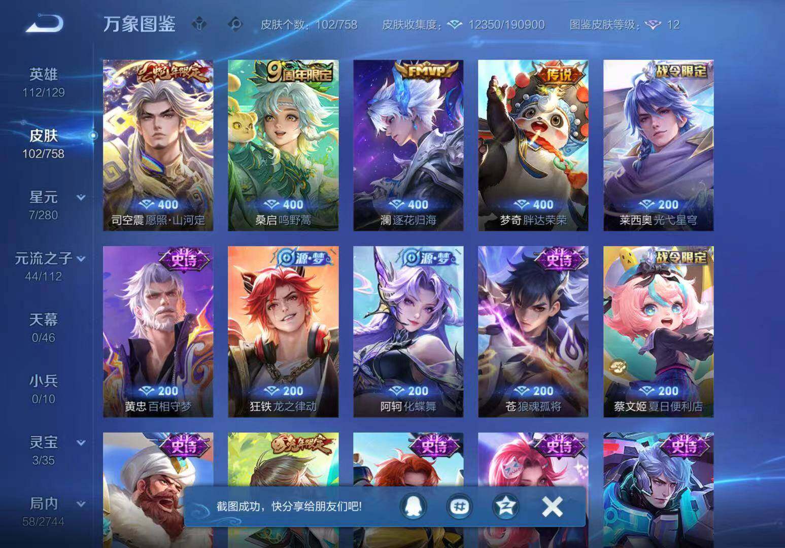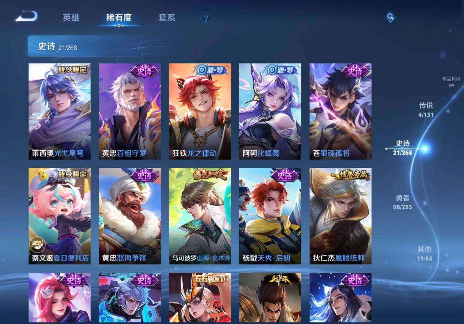 【史诗皮肤】:赵云皇家上将,王昭君偶像歌手,宫本武藏鬼剑武藏,孙尚香水果甜心,妲己魅力维加斯,曹操幽灵船长,李白千年之狐,张飞乱世虎臣,花木兰水晶猎龙者,亚瑟心灵战警,阿轲节奏热浪,狄仁杰鹰眼统帅,杨戬天秀启明,马可波罗山海玄木吟,黄忠怒海争锋,蔡文姬夏日便利店,苍狼魂孤将,阿轲化蝶舞,狂铁龙之律动,黄忠百相守梦,莱西奥光弋星穹