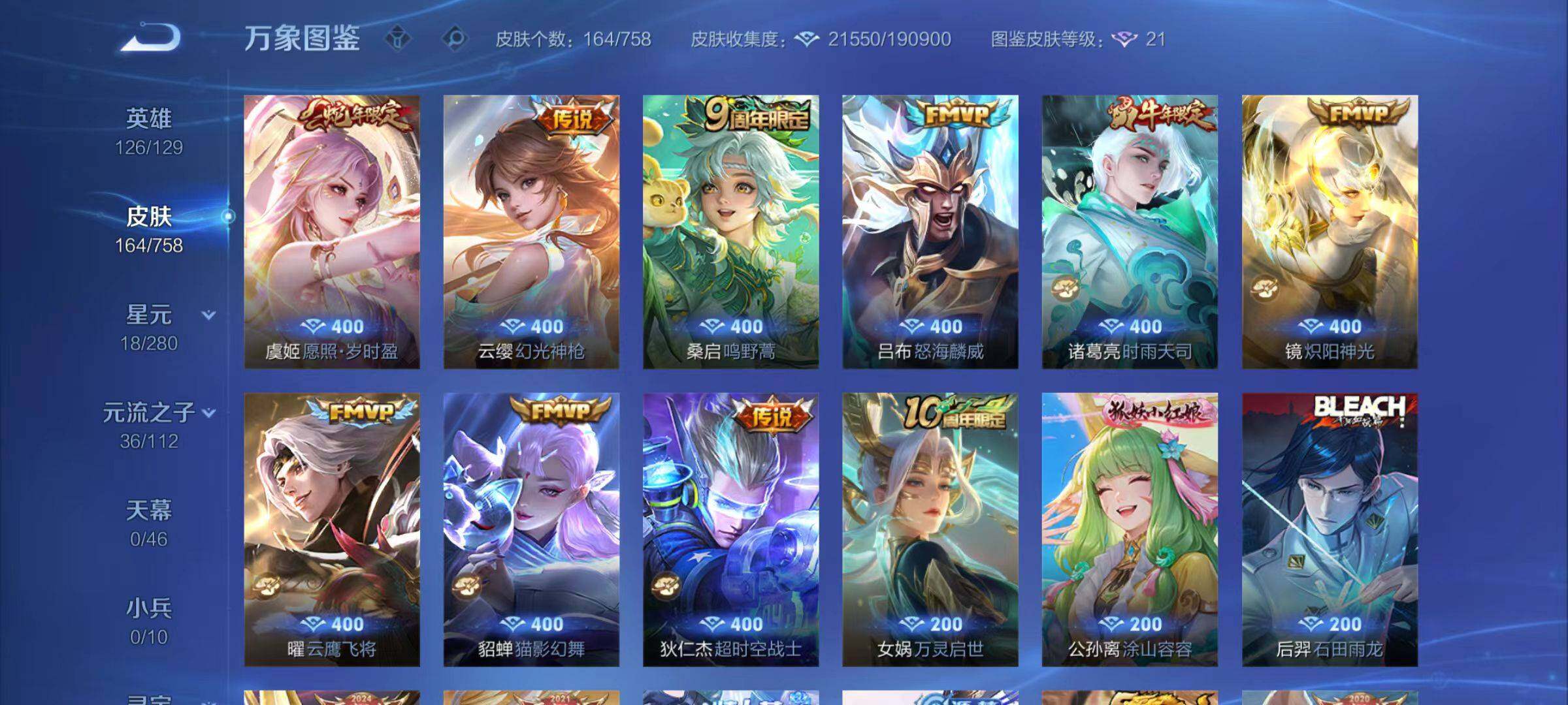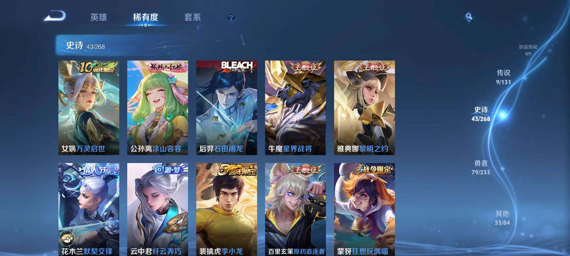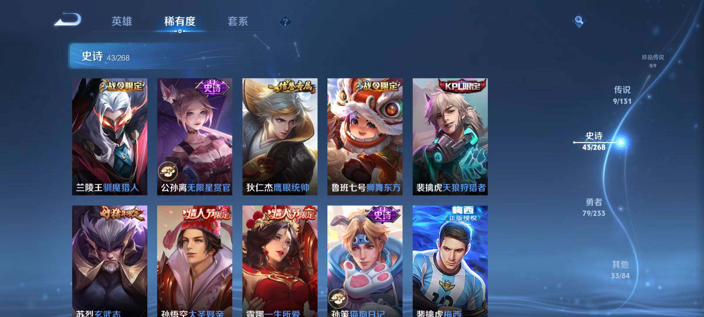 裴擒虎李小龙,上官婉儿梁祝,诸葛亮时雨天司,曹操天狼征服者,裴擒虎天狼狩猎者,苏烈玄武志,孙悟空大圣娶亲,露娜一生所爱,花木兰默契交锋,裴擒虎梅西,桑启鸣野蒿,虞姬愿照·岁时盈