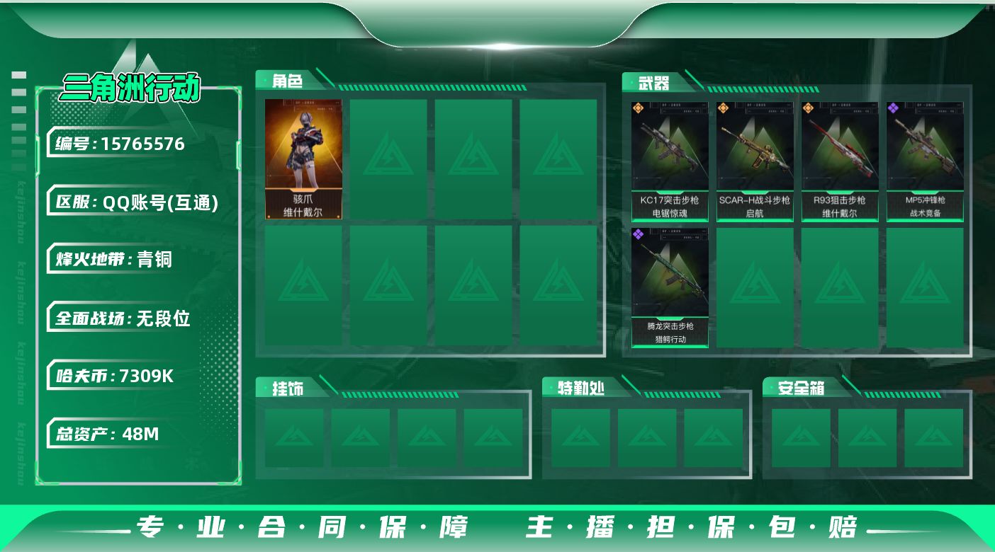 [15765576]【店主推荐捡漏号!可直接换绑】 7309k哈伏币-45m流动资产-32烽火等级-青铜-1战场等级-无军衔 【干员外观】:骇爪-维什戴尔 【近战皮肤】:近战-黑鹰 【传说外观】:SCAR-H战斗步枪-启航,KC17突击步枪-电锯惊魂,R93狙击步枪-维什戴尔 【史诗外观】:腾龙突击步枪-猎鳄行动,MP5冲锋枪-战术竞备 【稀有外观】:M7战斗步枪-捣蛋鬼,SCAR-H战斗步枪-荣耀列队,MP5冲锋枪-弄臣,P90冲锋枪-捣蛋鬼,Vector冲锋枪-先锋,UZI冲锋枪-亚特兰蒂斯,SMG-45冲锋枪-幻影结构,QJB201轻机枪-哈夫克卫队,Mini-14射手步枪-荣耀列队 【普通外观】:M4A1突击步枪-粉色涂装,M4A1突击步枪-海色,QBZ95-1突击步枪-高雅黑,QBZ95-1突击步枪-海浪,K416突击步枪-高雅黑,M7战斗步枪-红色涂装,SG552突击步枪-海浪,UZI冲锋枪-海色,野牛冲锋枪-高雅黑,M250通用机枪-条纹,SR-25射手步枪-黄蜂,沙漠之鹰-高雅黑 【载具外观】:轮式突击炮-荣耀 【军牌】:军牌-静谧时光,军牌-展示,军牌-信誉优秀 【挂饰】:挂饰-维什戴尔,挂饰-阿萨拉狙击兵,挂饰-阿萨拉霰弹兵*2,挂饰-诡影狙击兵*2,挂饰-诡影喷火兵*4,挂饰-启程,挂饰-阿萨拉徽章*7
