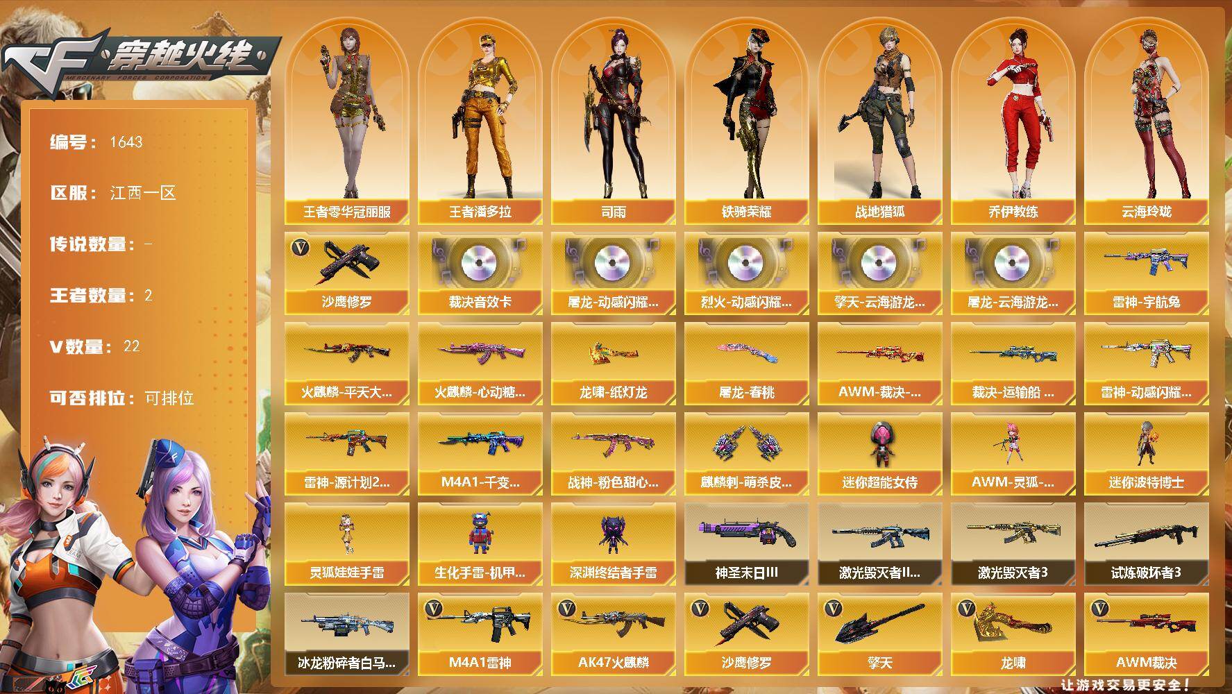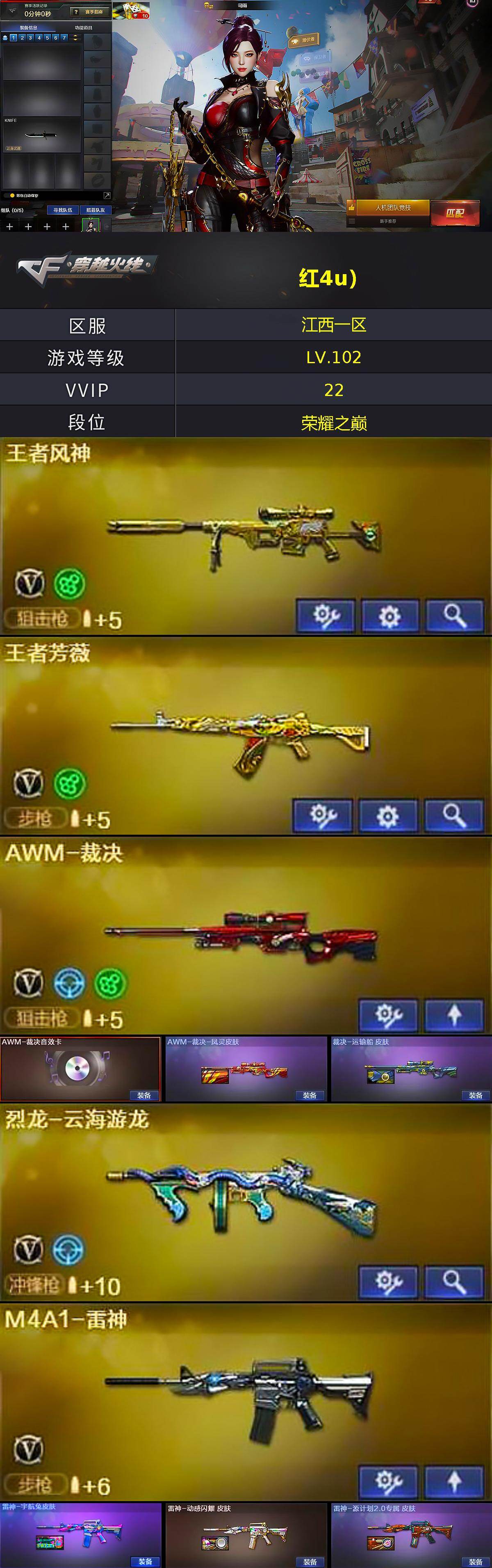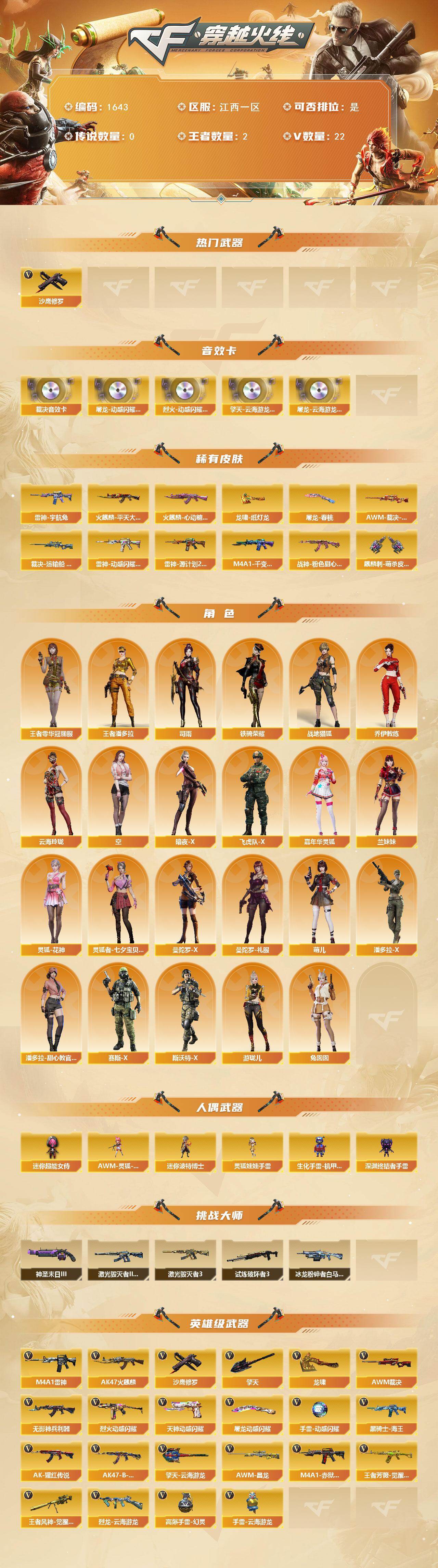 [15768244]江西一区-22V-2王者-0炫金 【热门武器】:沙鹰-修罗*2 【音效卡】:屠龙-动感闪耀 音效卡,烈火-动感闪耀 音效卡,擎天-云海游龙音效卡,屠龙-云海游龙音效卡,AWM-裁决音效卡 【皮肤】:AWM-裁决-凤灵皮肤,裁决-运输船 皮肤,雷神-宇航兔皮肤,雷神-动感闪耀 皮肤,雷神-源计划2.0专属 皮肤,火麒麟-平天大圣*2,火麒麟-心动糖果,M4A1-千变-孔明皮肤,战神-粉色甜心皮肤,屠龙-春桃 皮肤,龙啸-纸灯龙皮肤,麒麟刺-萌杀皮肤 【角色】:司雨,战地猎狐,王者零-华冠丽服,王者潘多拉,乔伊教练,云海玲珑,空,暗夜-X,飞虎队-X,嘉年华灵狐,兰妹妹,灵狐-花神,灵狐者-七夕宝贝,曼陀罗-X,曼陀罗-礼服,萌儿,潘多拉-X,潘多拉-甜心教官,赛斯-X,斯沃特-X,铁骑荣耀,兔囡囡,游珑儿 【人偶武器】:AWM-灵狐-15周年嘉年华,迷你波特博士,生化手雷-机甲核心,深渊终结者手雷,迷你超能女侍,灵狐娃娃手雷*2 【挑战大师】:冰龙粉碎者-白马银枪,激光毁灭者III-白马银枪,激光毁灭者III,试炼破坏者III,神圣爆裂者-末日III 【英雄级武器】:AK47-火麒麟,M4A1-雷神,无影-神兵利器,烈火-动感闪耀,AK-47-猩红传说,AK47-B-战神,黑骑士-海王,王者芳薇-觉醒版,AWM-裁决,王者风神-觉醒版,烈龙-云海游龙,沙鹰-修罗*2,天神-动感闪耀,龙啸,擎天,屠龙-动感闪耀,擎天-云海游龙,高爆手雷-幻灵,手雷-动感闪耀,手雷-云海游龙,M4A1-赤狱骑士,AWM-昌龙 【道具】:云海游龙炫彩背包,次元之矛-黄金背包,炫彩背包,女皇终结者-魔龙之吻,救世主-黑桃战神,绿色巨人,灵魂忍者*2,迷雾幽灵,夺命之镰,防化服*3,金色流光-枪王排位*2,星辰流光-枪王排位,流光-再燃火线,枪王排位28赛季金色流光,枪王排位29赛季金色流光,电玩兔兔表情,动感闪耀表情,云海游龙表情,防弹头盔*3,防弹衣*3,C4工具钳*3,手雷包*3 【特殊枪械】:
