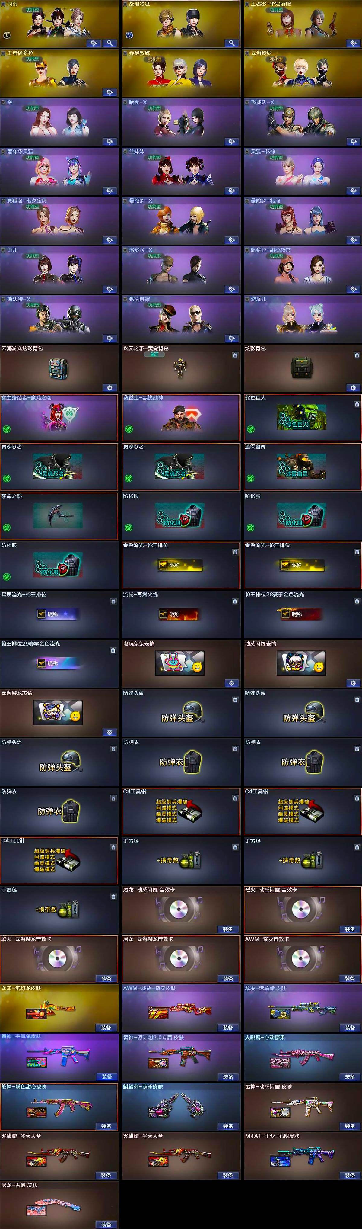 【道具】:云海游龙炫彩背包,次元之矛-黄金背包,炫彩背包,女皇终结者-魔龙之吻,救世主-黑桃战神,绿色巨人,灵魂忍者*2,迷雾幽灵,夺命之镰,防化服*3,金色流光-枪王排位*2,星辰流光-枪王排位,流光-再燃火线,枪王排位28赛季金色流光,枪王排位29赛季金色流光,电玩兔兔表情,动感闪耀表情,云海游龙表情,防弹头盔*3,防弹衣*3,C4工具钳*3,手雷包*3