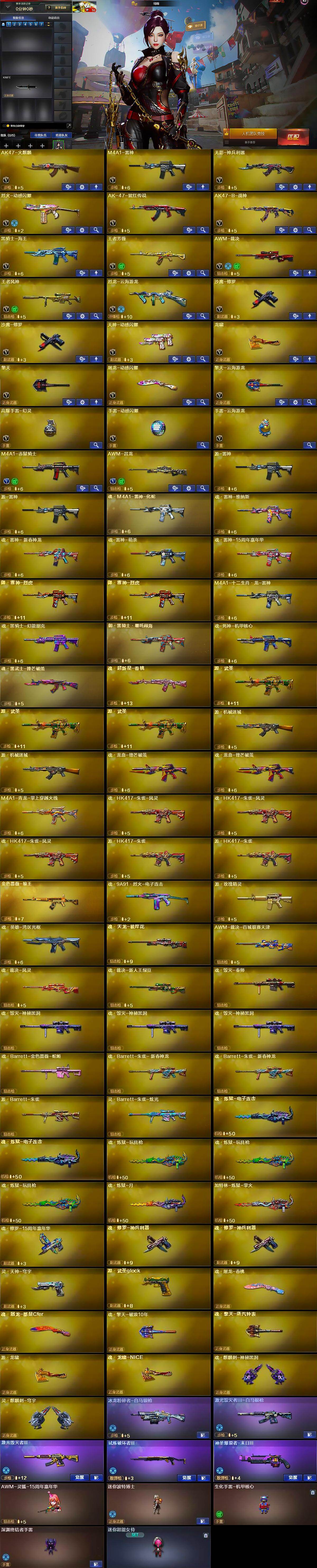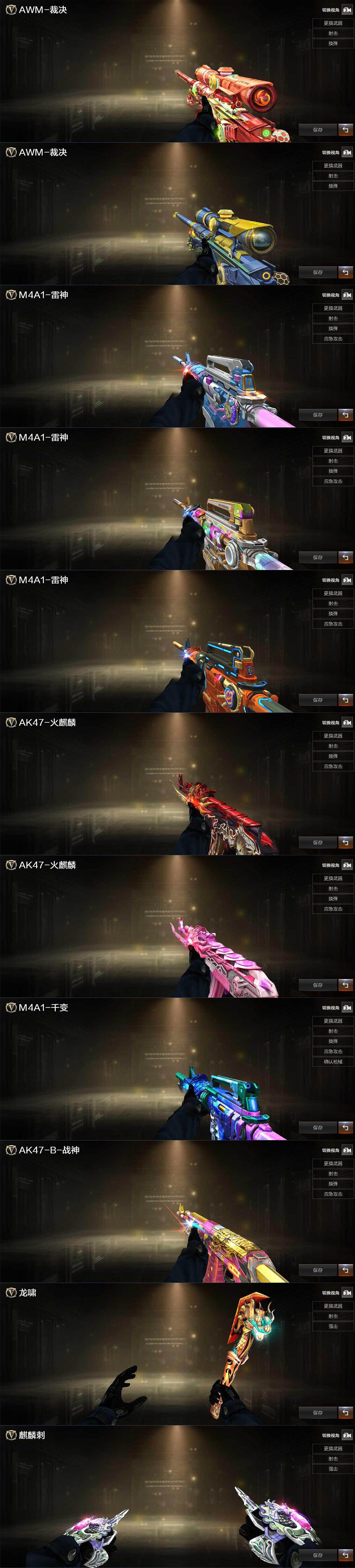 【英雄级武器】:AK47-火麒麟,M4A1-雷神,无影-神兵利器,烈火-动感闪耀,AK-47-猩红传说,AK47-B-战神,黑骑士-海王,王者芳薇-觉醒版,AWM-裁决,王者风神-觉醒版,烈龙-云海游龙,沙鹰-修罗*2,天神-动感闪耀,龙啸,擎天,屠龙-动感闪耀,擎天-云海游龙,高爆手雷-幻灵,手雷-动感闪耀,手雷-云海游龙,M4A1-赤狱骑士,AWM-昌龙