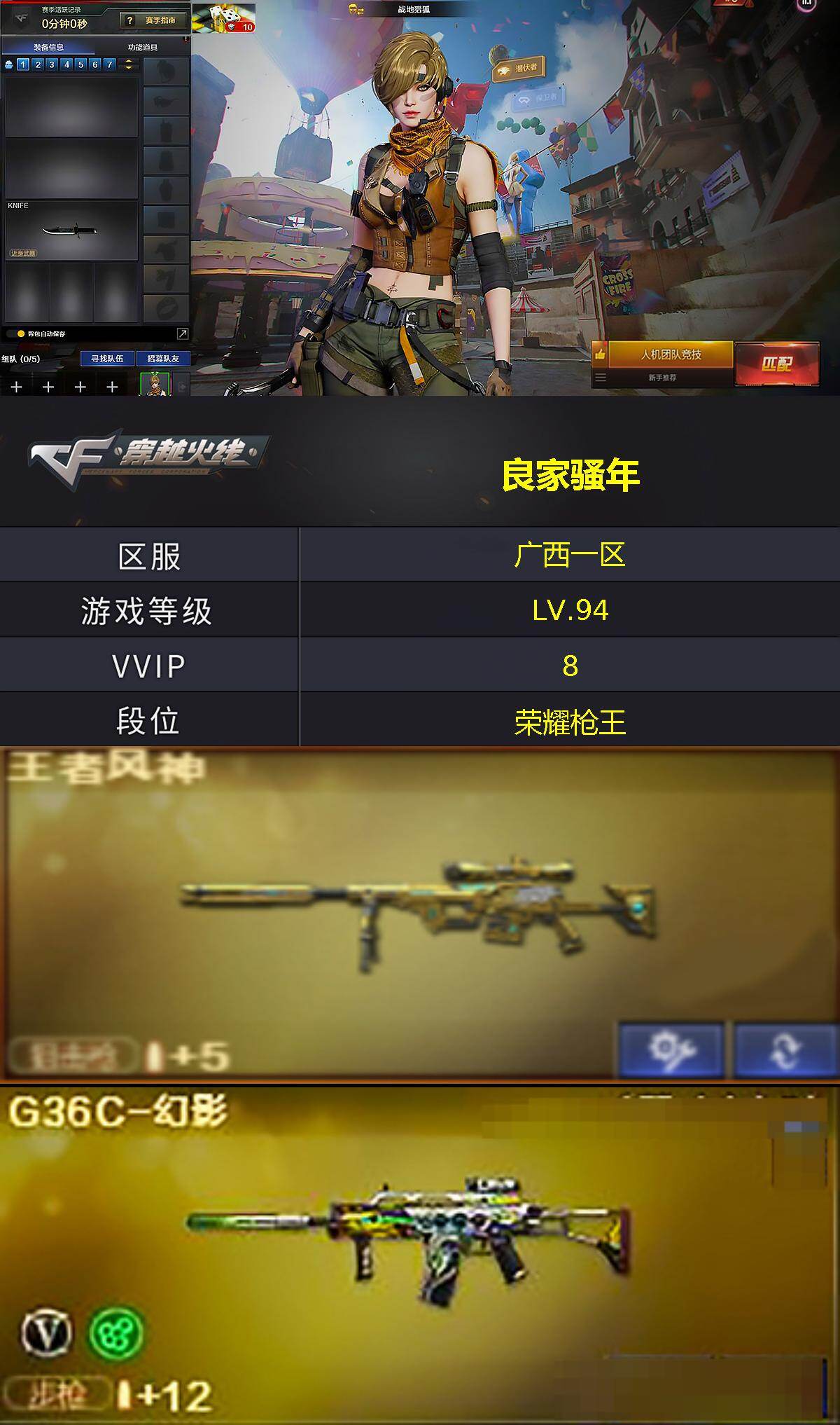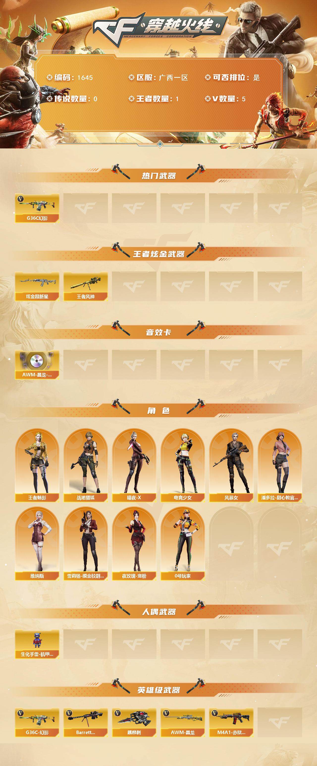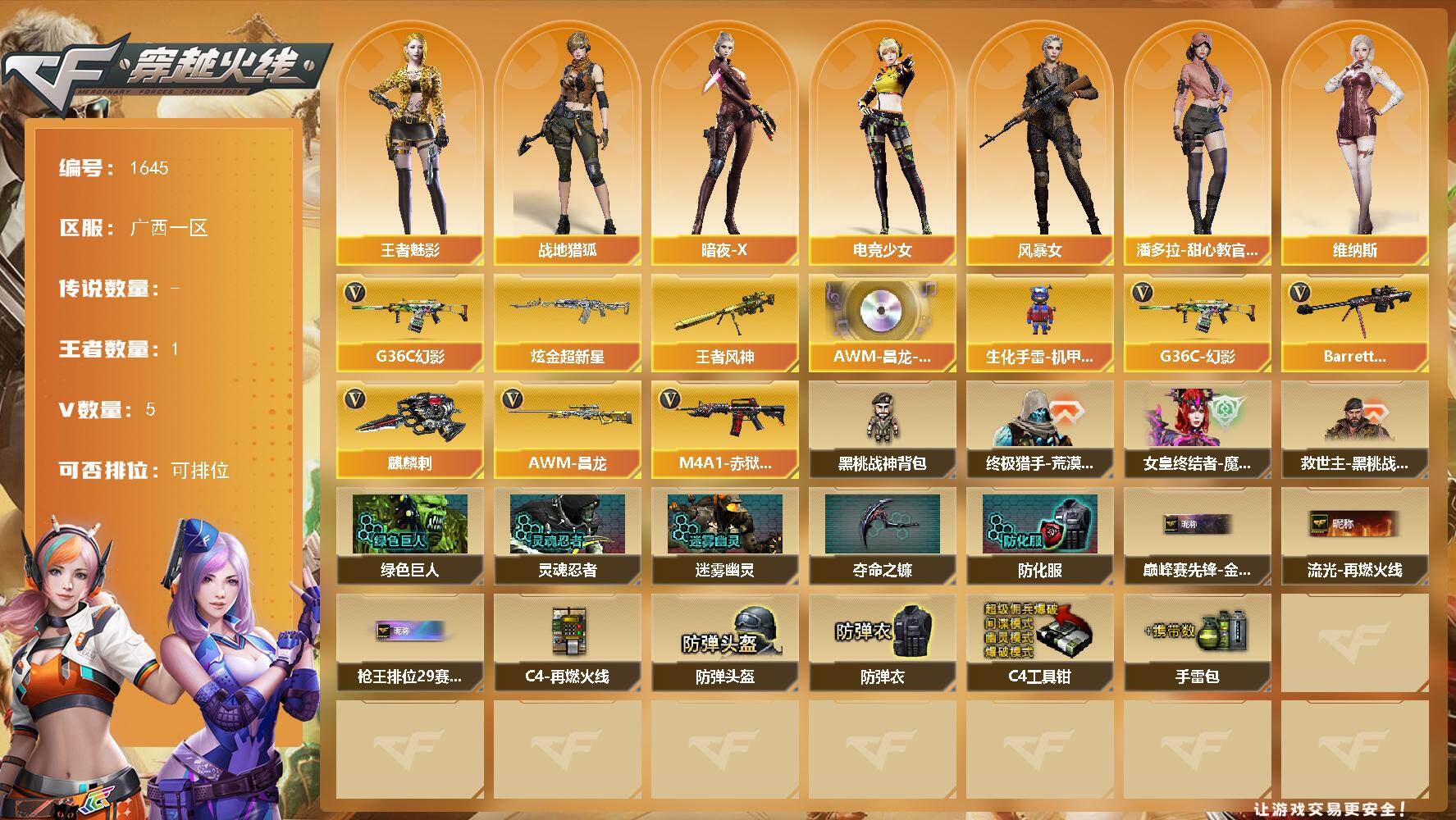 [15768707]广西一区-5V-1王者-1炫金 【热门武器】:G36C-幻影 【王者炫金武器】:王者风神,炫金超新星 【音效卡】:AWM-昌龙-怀旧音效卡 【角色】:战地猎狐,王者-魅影,暗夜-X,电竞少女,风暴女,0号玩家,潘多拉-甜心教官,维纳斯,雪莉杨-摸金校尉,夜玫瑰-宠粉 【人偶武器】:生化手雷-机甲核心 【英雄级武器】:G36C-幻影,Barrett-毁灭,麒麟刺,M4A1-赤狱骑士,AWM-昌龙 【道具】:黑桃战神背包,终极猎手-荒漠刀客,女皇终结者-魔龙之吻,救世主-黑桃战神,绿色巨人,灵魂忍者,迷雾幽灵,夺命之镰,防化服*2,巅峰赛先锋-金色流光,流光-再燃火线,枪王排位28赛季金色流光,枪王排位29赛季金色流光,C4-再燃火线,防弹头盔*4,防弹衣*4,C4工具钳*4,手雷包*4 【特殊枪械】: