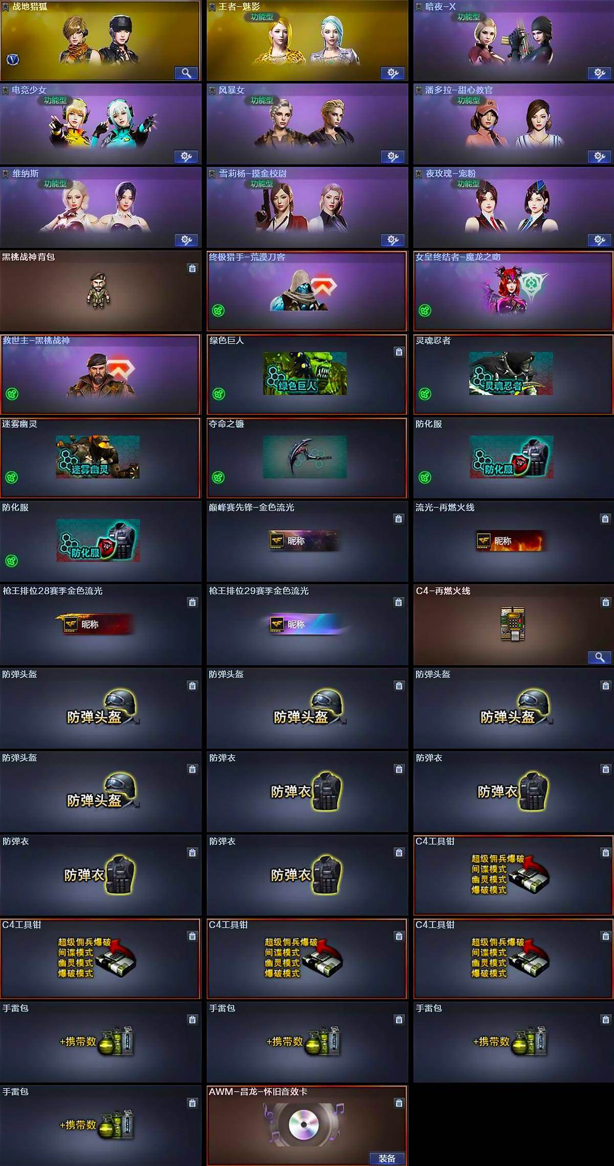 【道具】:黑桃战神背包,终极猎手-荒漠刀客,女皇终结者-魔龙之吻,救世主-黑桃战神,绿色巨人,灵魂忍者,迷雾幽灵,夺命之镰,防化服*2,巅峰赛先锋-金色流光,流光-再燃火线,枪王排位28赛季金色流光,枪王排位29赛季金色流光,C4-再燃火线,防弹头盔*4,防弹衣*4,C4工具钳*4,手雷包*4