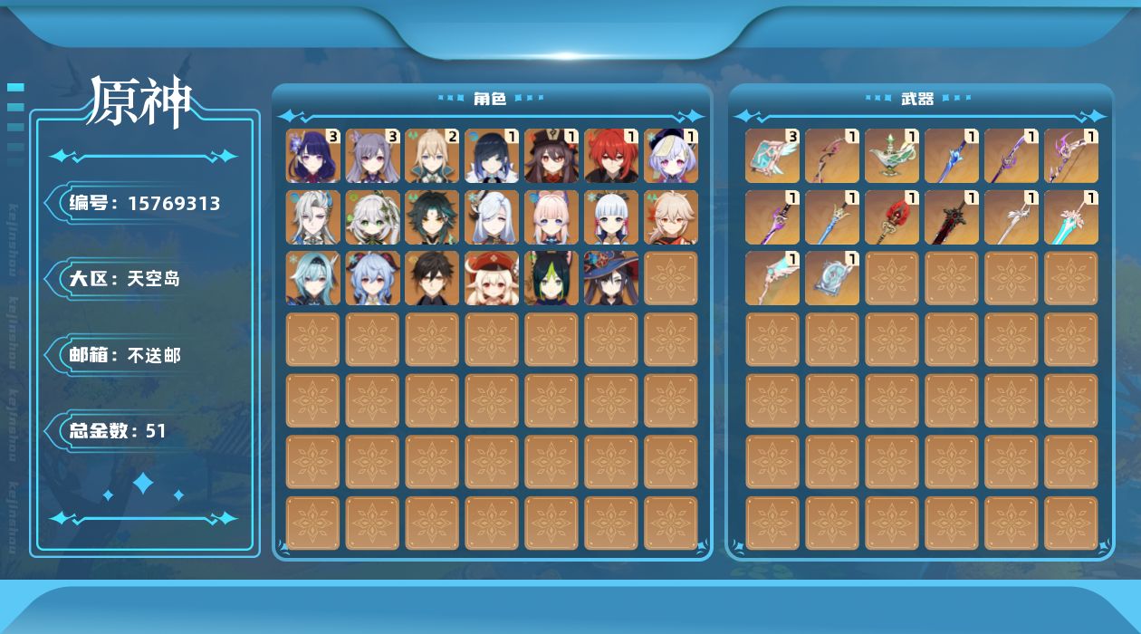 0命那维莱特,0命纳西妲,0命提纳里,1命夜兰,0命申鹤,0命优菈,3命雷电将军,0命枫原万叶,0命神里绫华,0命钟离,1命胡桃,0命甘雨,0命魈,0命可莉,0命珊瑚宫心海,3命刻晴,1命七七,2命琴,0命莫娜,1命迪卢克,精1最初的大魔术,精1千夜浮梦,精1波乱月白经津,精1薙草之稻光,精1飞雷之弦振,精1雾切之回光,精1苍古自由之誓,精1护摩之杖,精1四风原典,精1天空之翼,精3天空之卷,精1风鹰剑,精1狼的末路,精1天空之傲