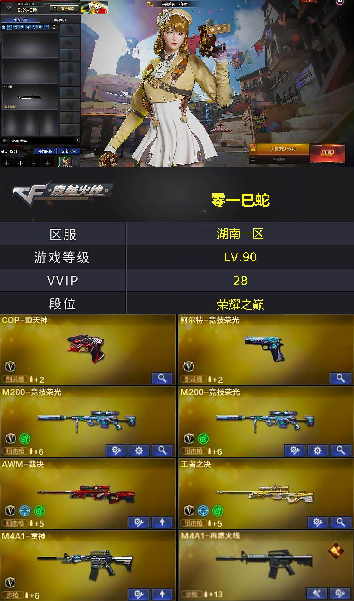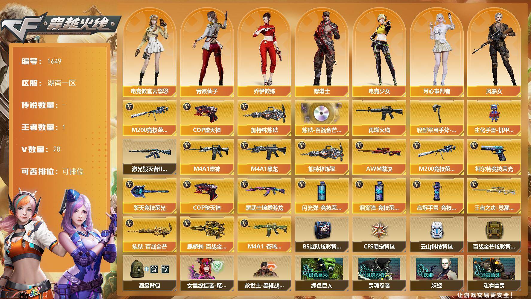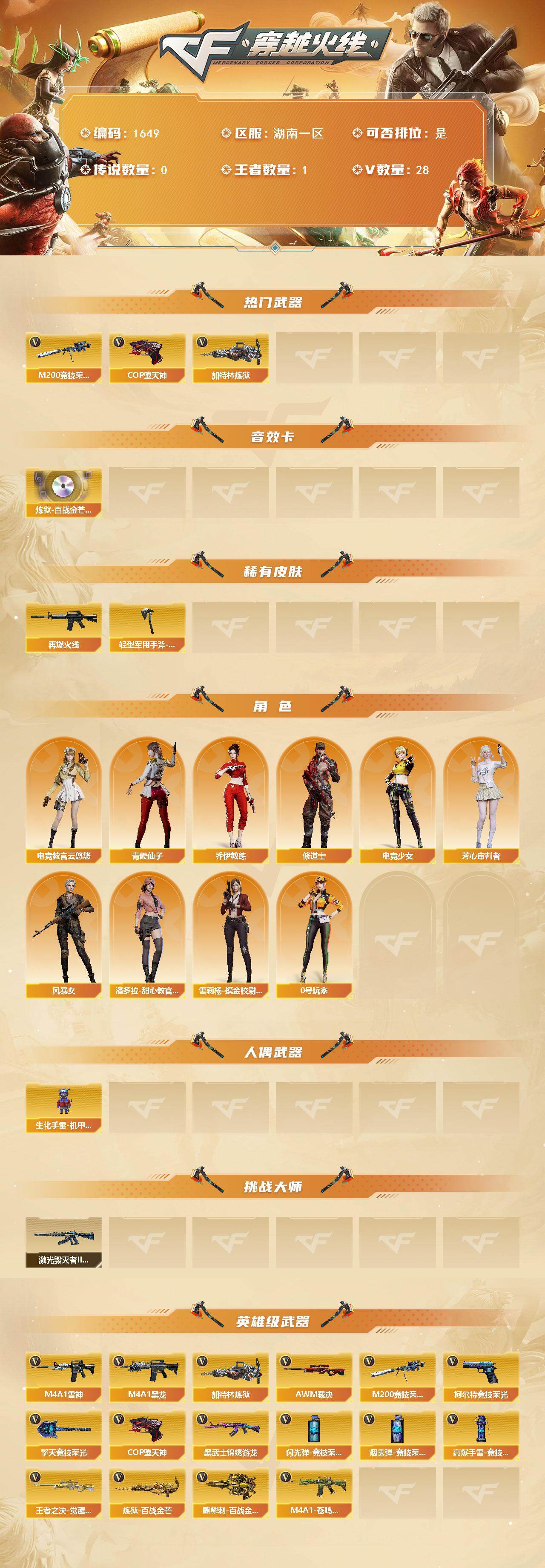 [15769407]湖南一区-28V-1王者-0炫金 【热门武器】:M200-竞技荣光*2,加特林-炼狱,COP-堕天神 【音效卡】:炼狱-百战金芒-庆典舞曲音效卡 【皮肤】:M4A1-再燃火线,轻型军用手斧-再燃火线 【角色】:电竞教官-云悠悠,乔伊教练,修道士,电竞少女,芳心审判者,风暴女,0号玩家,潘多拉-甜心教官,青霞仙子,雪莉杨-摸金校尉 【人偶武器】:生化手雷-机甲核心 【挑战大师】:激光毁灭者III-白马银枪 【英雄级武器】:M4A1-黑龙,M4A1-雷神,黑武士-锦绣游龙,AWM-裁决,M200-竞技荣光*2,王者之决-觉醒版,加特林-炼狱,炼狱-百战金芒,COP-堕天神,柯尔特-竞技荣光,擎天-竞技荣光*2,麒麟刺-百战金芒,高爆手雷-竞技荣光*2,闪光弹-竞技荣光*2,烟雾弹-竞技荣光*2,M4A1-苍鸣雷神 【道具】:BS战队炫彩背包,CFS限定背包,云山科技背包,百战金芒炫彩背包,超级背包,女皇终结者-魔龙之吻,救世主-黑桃战神,绿色巨人,灵魂忍者*2,妖姬,迷雾幽灵,生化弹匣,夺命之镰,防化服*2,金色流光-枪王排位*2,星辰流光-枪王排位,流光-再燃火线,枪王排位28赛季金色流光,枪王排位29赛季金色流光,语音特效-盛典烟火,萌萌小葵表情,热带奇洋表情,EP战队名片,EP战队喷图,EP战队击杀图标,C4-红龙,防弹头盔*2,防弹衣*2,C4工具钳*2,手雷包*2 【特殊枪械】:1炼狱
