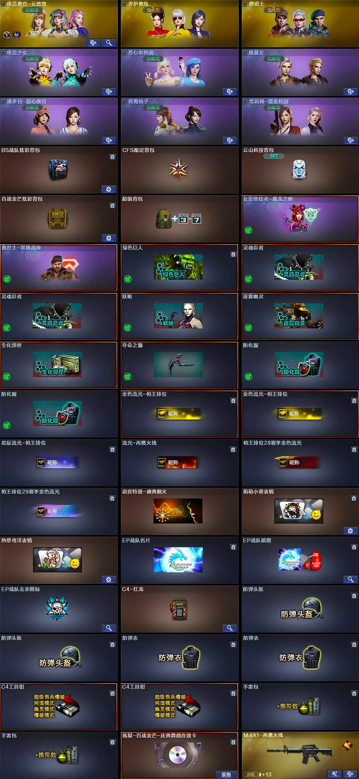 【道具】:BS战队炫彩背包,CFS限定背包,云山科技背包,百战金芒炫彩背包,超级背包,女皇终结者-魔龙之吻,救世主-黑桃战神,绿色巨人,灵魂忍者*2,妖姬,迷雾幽灵,生化弹匣,夺命之镰,防化服*2,金色流光-枪王排位*2,星辰流光-枪王排位,流光-再燃火线,枪王排位28赛季金色流光,枪王排位29赛季金色流光,语音特效-盛典烟火,萌萌小葵表情,热带奇洋表情,EP战队名片,EP战队喷图,EP战队击杀图标,C4-红龙,防弹头盔*2,防弹衣*2,C4工具钳*2,手雷包*2