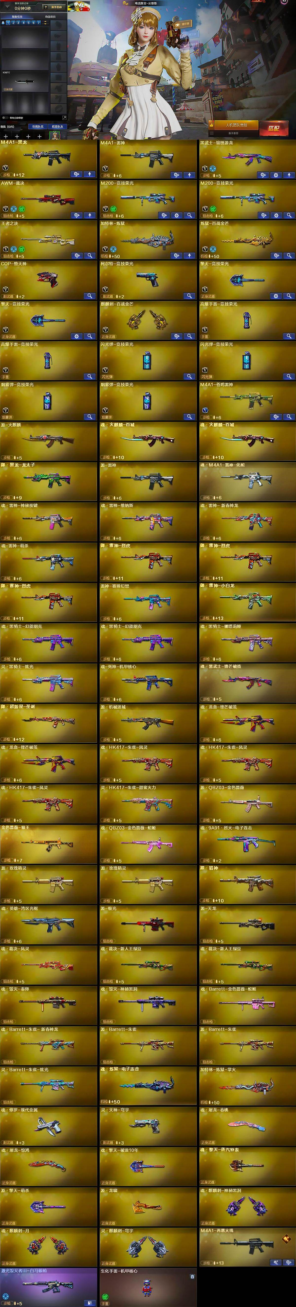 【英雄级武器】:M4A1-黑龙,M4A1-雷神,黑武士-锦绣游龙,AWM-裁决,M200-竞技荣光*2,王者之决-觉醒版,加特林-炼狱,炼狱-百战金芒,COP-堕天神,柯尔特-竞技荣光,擎天-竞技荣光*2,麒麟刺-百战金芒,高爆手雷-竞技荣光*2,闪光弹-竞技荣光*2,烟雾弹-竞技荣光*2,M4A1-苍鸣雷神