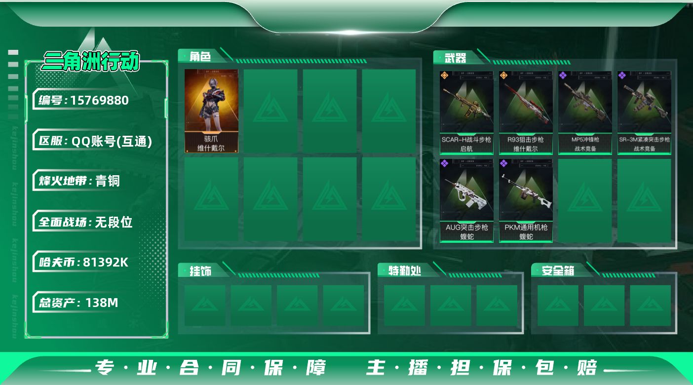 [15769880]【店主推荐捡漏号!可直接换绑】 81392k哈伏币-132m流动资产-48烽火等级-青铜-4战场等级-无军衔 【干员外观】:骇爪-维什戴尔 【近战皮肤】:近战-黑鹰 【传说外观】:SCAR-H战斗步枪-启航,R93狙击步枪-维什戴尔 【史诗外观】:AUG突击步枪-蝮蛇,MP5冲锋枪-战术竞备,SR-3M紧凑突击步枪-战术竞备,PKM通用机枪-蝮蛇 【稀有外观】:K416突击步枪-星之彩,AS Val突击步枪-地平线,M7战斗步枪-捣蛋鬼,SCAR-H战斗步枪-荣耀列队,MP5冲锋枪-弄臣,P90冲锋枪-捣蛋鬼,SMG-45-行动开启,M1014霰弹枪-幻影结构,PKM轻机枪-前沿科技,QJB201轻机枪-哈夫克卫队,Mini-14射手步枪-荣耀列队,SKS射手步枪-弄臣,SR-25射手步枪-开拓,G18-星链科技,G18-哈夫克航天 【普通外观】:M16A4突击步枪-常青藤,AK-12突击步枪-旧工业,M4A1突击步枪-海色,QBZ95-1突击步枪-高雅黑,QBZ95-1突击步枪-海浪,K416突击步枪-几何迷彩,M16A4突击步枪-高雅黑,AUG突击步枪-浅蓝涂装,SG552突击步枪-海浪,G3战斗步枪-高雅黑,PTR-32突击步枪-黄蜂,MP5冲锋枪-海色,MP5冲锋枪-黄蜂,Vector冲锋枪-几何迷彩,UZI冲锋枪-海色,野牛冲锋枪-高雅黑,M249轻机枪-黄蜂,M250通用机枪-条纹,SVD狙击步枪-高雅黑,SR-25射手步枪-黄蜂,QSZ92G-条纹,沙漠之鹰-海浪,沙漠之鹰-高雅黑 【载具外观】:轮式突击炮-荣耀 【军牌】:军牌-装备修理,军牌-修整,军牌-信誉优秀 【挂饰】:挂饰-维什戴尔,挂饰-蚀金玫瑰,挂饰-阿萨拉狙击兵,挂饰-阿萨拉霰弹兵,挂饰-诡影狙击兵*4,挂饰-诡影喷火兵*2,挂饰-启程,挂饰-阿萨拉徽章*8
