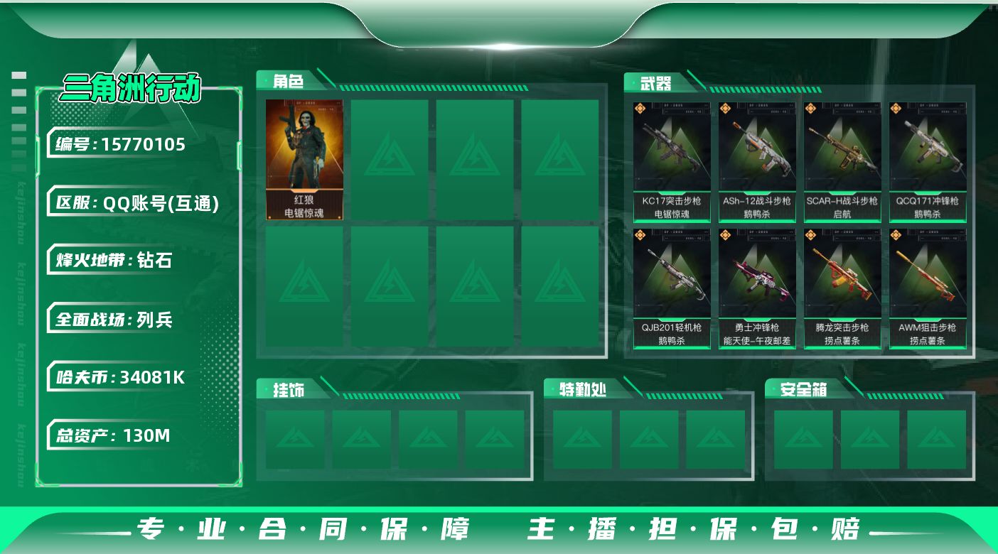 [15770105]【店主推荐捡漏号!可直接换绑】34081k哈伏币-119m流动资产-60烽火等级-钻石-7战场等级-列兵 【干员外观】:红狼-电锯惊魂 【近战皮肤】:近战-黑鹰 【传说外观】:M4A1突击步枪-阿米娅,ASh-12战斗步枪-鹅鸭杀,AK-12突击步枪-特斯拉线圈,SCAR-H战斗步枪-启航,CAR-15突击步枪-阿米娅,腾龙突击步枪-捞点薯条,KC17突击步枪-电锯惊魂,UZI冲锋枪-特斯拉线圈,SR-3M紧凑突击步枪-特斯拉线圈,勇士冲锋枪-能天使-午夜邮差,QCQ171冲锋枪-鹅鸭杀,QJB201轻机枪-鹅鸭杀,AWM狙击步枪-捞点薯条,93R-捞点薯条,复合弓-黑·天际线 【史诗外观】:M16A4突击步枪-竞赛选手,AUG突击步枪-蝮蛇,SCAR-H战斗步枪-囚徒,MP5冲锋枪-深海恐惧,MP5冲锋枪-战术竞备,MP5冲锋枪-竞技风,SR-3M紧凑突击步枪-战术竞备,勇士冲锋枪-工业狂潮,M250通用机枪-囚徒,SVD狙击步枪-阿萨拉工艺,SV-98狙击步枪-林中猎手,SV-98狙击步枪-囚徒,SV-98狙击步枪-猎鳄行动 【稀有外观】:AKM突击步枪-肃杀,QBZ95-1突击步枪-公平竞技,M7战斗步枪-捣蛋鬼,SCAR-H战斗步枪-荣耀列队,腾龙突击步枪-冰天雪地,MP5冲锋枪-弄臣,MP5冲锋枪-虎啸,MP5冲锋枪-哈夫克卫队,P90冲锋枪-黄昏,Vector冲锋枪-先锋,UZI冲锋枪-亚特兰蒂斯,SMG-45-行动开启,SMG-45冲锋枪-幻影结构,SMG-45冲锋枪-天网,QJB201轻机枪-哈夫克卫队,Mini-14射手步枪-荣耀列队,SKS射手步枪-弄臣,SR-25射手步枪-开拓,SR-9射手步枪-街头涂鸦,SV-98狙击步枪-星链科技,SV-98狙击步枪-哈夫克航天,SV-98狙击步枪-精英联盟,G18-星链科技,G18-哈夫克航天 【普通外观】:M4A1突击步枪-粉色涂装,M4A1突击步枪-高雅黑,M4A1突击步枪-海色,QBZ95-1突击步枪-高雅黑,QBZ95-1突击步枪-海浪,QBZ95-1突击步枪-海色,QBZ191突击步枪-三角洲力量,K416突击步枪-几何迷彩,K416突击步枪-高雅黑,M16A4突击步枪-山林猎人,M16A4突击步枪-高雅黑,AUG突击步枪-浅蓝涂装,M7战斗步枪-红色涂装,SG552突击步枪-浅蓝涂装,SG