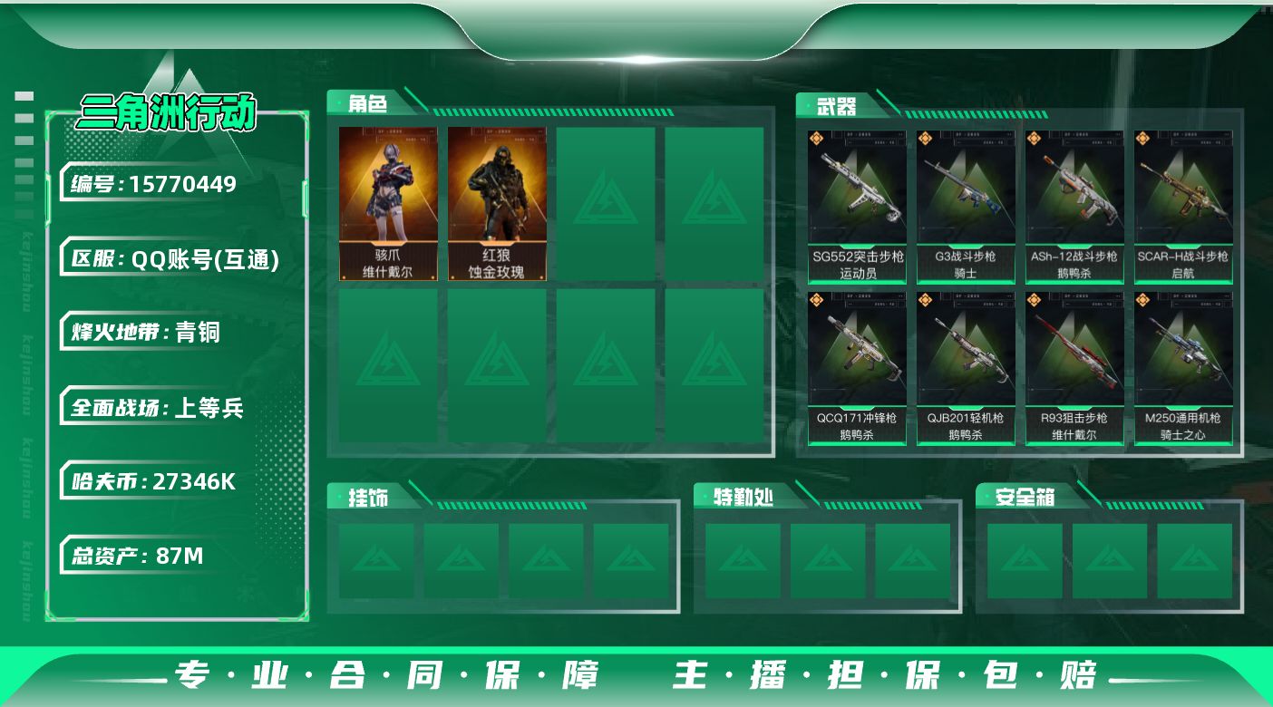[15770449]总资产87m【店主推荐捡漏号!可直接换绑】27346k哈伏币-70m流动资产-60烽火等级-青铜-24战场等级-上等兵 【干员外观】:红狼-蚀金玫瑰,骇爪-维什戴尔 【近战皮肤】:近战-黑鹰 【传说外观】:M4A1突击步枪-蚀金玫瑰,ASh-12战斗步枪-鹅鸭杀,SG552突击步枪-运动员,SCAR-H战斗步枪-启航,G3战斗步枪-骑士,QCQ171冲锋枪-鹅鸭杀,M250通用机枪-骑士之心,QJB201轻机枪-鹅鸭杀,R93狙击步枪-维什戴尔 【史诗外观】:MP5冲锋枪-战术竞备,SR-3M紧凑突击步枪-战术竞备,MP7冲锋枪-守护者,M700狙击步枪-竞技风,AWM狙击步枪-无极限,复合弓-守护者 【稀有外观】:M14射手步枪-花岗岩,M7战斗步枪-前沿科技,M7战斗步枪-捣蛋鬼,SCAR-H战斗步枪-荣耀列队,G3战斗步枪-战术演练,G3战斗步枪-主宰,K437突击步枪-生存指令,MK47突击步枪-精英联盟,MP5冲锋枪-哈夫克卫队,Vector冲锋枪-先锋,野牛冲锋枪-公平竞技,SMG-45-行动开启,S12K霰弹枪-战术演练,QJB201轻机枪-黄昏,QJB201轻机枪-哈夫克卫队,Mini-14射手步枪-荣耀列队,SKS射手步枪-弄臣,SV-98狙击步枪-星链科技,SV-98狙击步枪-哈夫克航天,SV-98狙击步枪-精英联盟 【普通外观】:AK-12突击步枪-旧工业,勇士冲锋枪-旧工业,PKM通用机枪-旧工业,M4A1突击步枪-隐秘行动,QBZ95-1突击步枪-高雅黑,QBZ95-1突击步枪-海浪,K416突击步枪-高雅黑,M16A4突击步枪-高雅黑,AUG突击步枪-浅蓝涂装,SCAR-H战斗步枪-红色涂装,SCAR-H战斗步枪-电路图,PTR-32突击步枪-黄蜂,PTR-32突击步枪-条纹,CAR-15突击步枪-变色龙,MP5冲锋枪-海色,P90冲锋枪-电路图,Vector冲锋枪-几何迷彩,UZI冲锋枪-海色,野牛冲锋枪-高雅黑,SMG-45冲锋枪-条纹,M1014霰弹枪-高雅黑,M1014霰弹枪-海浪,725双管霰弹枪-条纹,M250通用机枪-条纹,QJB201轻机枪-磐石,SVD狙击步枪-高雅黑,SVD狙击步枪-电路图,SR-25射手步枪-黄蜂,SV-98狙击步枪-红色涂装,SV-98狙击步枪-条纹,QSZ92G-电路图,QSZ92G-条纹,沙漠
