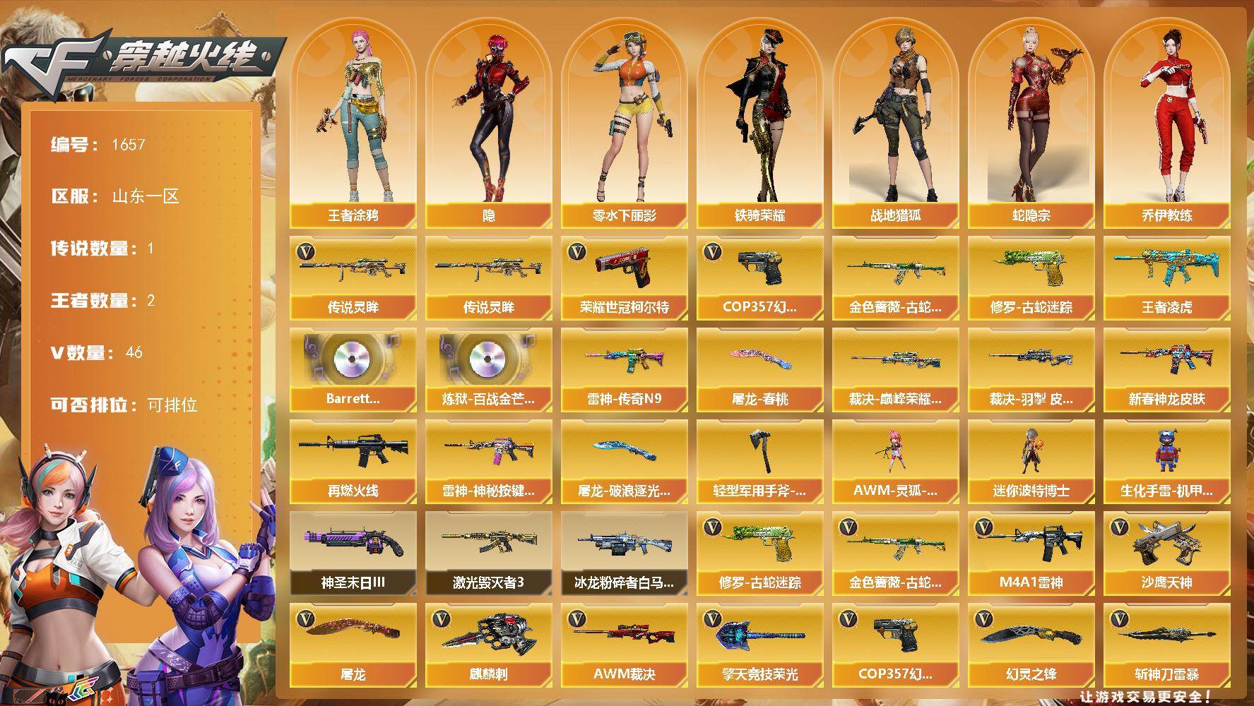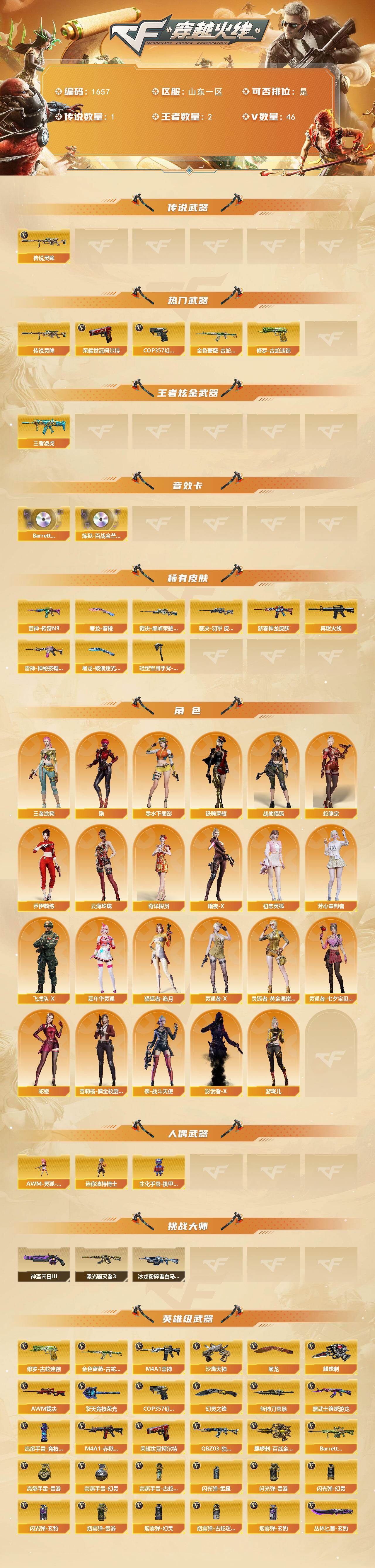 [15770851]山东一区-46V-2王者-0炫金 【传说武器】:传说灵眸 【热门武器】:传说灵眸,金色蔷薇-古蛇迷踪,修罗-古蛇迷踪,荣耀世冠-柯尔特,COP 357-幻灵 【王者炫金武器】:王者凌虎 【音效卡】:Barrett-碧霄极光音效卡,炼狱-百战金芒-庆典舞曲音效卡 【皮肤】:裁决-巅峰荣耀 皮肤,裁决-羽掣 皮肤,雷神-传奇N9,M4A1-雷神-新春神龙皮肤,M4A1-再燃火线,雷神-神秘按键 皮肤,屠龙-春桃 皮肤,屠龙-破浪逐光 皮肤,轻型军用手斧-再燃火线 【角色】:隐,战地猎狐,王者涂鸦,蛇隐宗,奇洋探员,乔伊教练,云海玲珑,暗夜-X,初恋灵狐,芳心审判者,飞虎队-X,嘉年华灵狐,猎狐者-追月,零-水下丽影,灵狐者-X,灵狐者-黄金海岸,灵狐者-七夕宝贝,蛇姬,铁骑荣耀,雪莉杨-摸金校尉,樱-战斗天使,影武者-X,游珑儿 【人偶武器】:AWM-灵狐-15周年嘉年华,迷你波特博士,生化手雷-机甲核心*2 【挑战大师】:冰龙粉碎者-白马银枪,激光毁灭者III*2,神圣爆裂者-末日III 【英雄级武器】:M4A1-雷神,黑武士-锦绣游龙,金色蔷薇-古蛇迷踪,QBZ03-独角-IV,AWM-裁决,沙鹰-天神,COP 357-幻灵,荣耀世冠-柯尔特,修罗-古蛇迷踪,屠龙*2,麒麟刺,幻灵之锋,擎天-竞技荣光,斩神刀-雷暴,麒麟刺-百战金芒,丛林匕首-玄豹,高爆手雷-雷暴,高爆手雷-幻灵*4,高爆手雷-竞技荣光,高爆手雷-古蛇迷踪,闪光弹-雷霆,闪光弹-雷暴,闪光弹-幻灵*4,闪光弹-玄豹,烟雾弹-雷暴,烟雾弹-幻灵*7,烟雾弹-古蛇迷踪,烟雾弹-玄豹,M4A1-赤狱骑士,Barrett-碧霄极光 【道具】:CFS限定背包,亚洲杯纪念炫彩背包,古蛇迷踪炫彩背包,百战金芒炫彩背包,超级背包,哔哩哔哩名片,女皇终结者-魔龙之吻,救世主-黑桃战神,绿色巨人,灵魂忍者,迷雾幽灵,夺命之镰,防化服*3,金色流光-枪王排位*2,星辰流光-枪王排位,巅峰赛先锋-金色流光,枪王排位28赛季金色流光,枪王排位29赛季金色流光,语音特效-盛典烟火,古蛇迷踪打击特效,蛇隐宗表情,萌萌小葵表情,热带奇洋表情,斯沃特表情,EP战队名片,EP战队喷图,EP战队击杀图标,防弹头盔*3,防弹衣*3,C4工具钳*3,手雷包*3 【特殊枪械】: