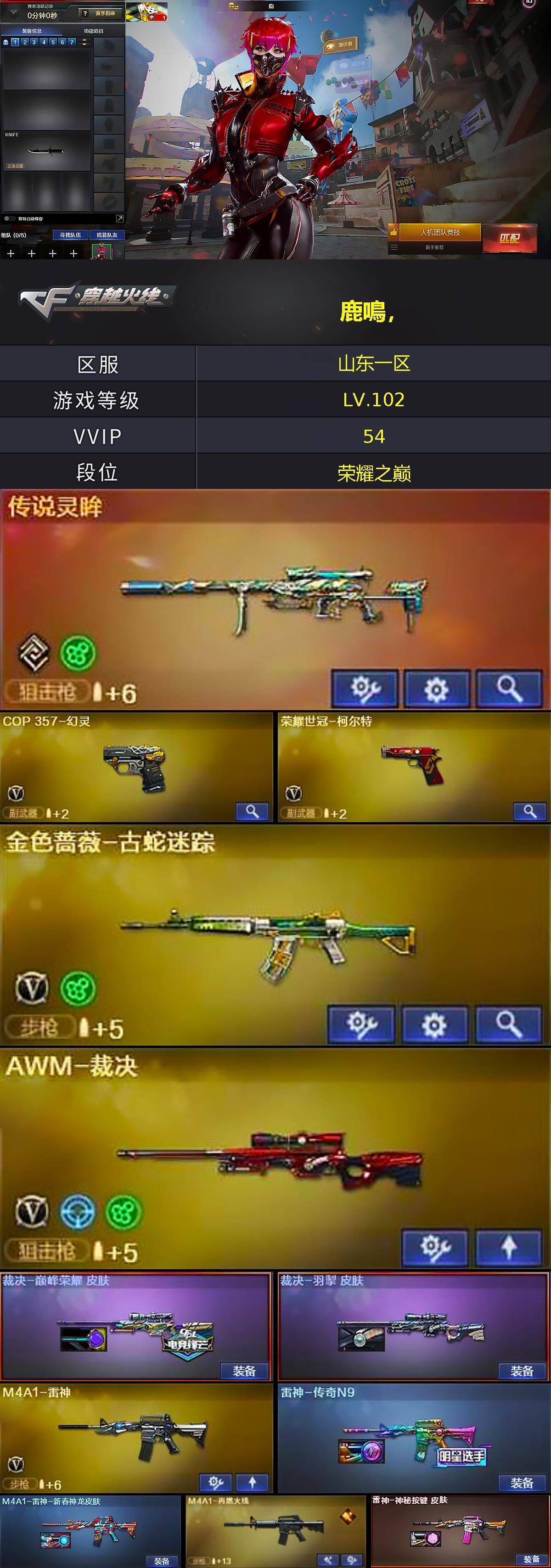 - [15146335]河南一区-20V-0王者-0炫金 【热门武器】:QBZ03-金色蔷薇,M200-竞技荣光,白虎-电玩蓝兔,USP-雷暴 【皮肤】:火麒麟-平天大圣,黑骑士-暗月,战神-粉色甜心皮肤,AK47-B-常胜将军-刘备 【角色】:电竞教官-云悠悠,战地猎狐,乔伊教练,云海玲珑,暗夜-X,初恋灵狐,芳心审判者,飞虎队-X,风暴女,虎妞,嘉年华灵狐,灵狐者-X,龙儿-小淘气,麻雀,曼陀罗-X,潘多拉-X,潜龙队-X,青霞仙子,斯沃特-X,甜心偶像,兔囡囡,维纳斯,樱-战斗天使,游珑儿 【人偶武器】:迷你深渊冰龙,迷你裂空之翼,迷你波特博士,夺魂*2,迷你火种,生化手雷-机甲核心,深渊终结者手雷,迷你艾比,迷你超能女侍 【暴走生化】:黑龙吞噬者,超级对讲机 【挑战大师】:机甲撕裂者III,神圣爆裂者-末日III,阐释者III 【英雄级武器】:AK47-火麒麟,M4A1-雷神,QBZ03-金色蔷薇,烈火-动感闪耀,AK47-B-战神,白虎-电玩蓝兔,M200-竞技荣光,USP-雷暴,柯尔特-竞技荣光,天神-动感闪耀,擎天-竞技荣光,屠龙-动感闪耀,高爆手雷-竞技荣光,手雷-云海游龙,闪光弹-雷霆,闪光弹-竞技荣光,烟雾弹-竞技荣光,M4A1-赤狱骑士 【道具】:CFS限定背包,全能枪王背包,虎牙炫彩背包,哔哩哔哩名片,女皇终结者-魔龙之吻,救世主-黑桃战神,绿色巨人,灵魂忍者,变异宝贝,迷雾幽灵,生化弹匣,夺命之镰,防化服*2,金色流光-枪王排位*2,星辰流光-枪王排位,流光-再燃火线,枪王排位28赛季金色流光,枪王排位29赛季金色流光,语音特效-机器人,电玩兔兔表情,动感闪耀表情,EP战队名片,防弹头盔*3,防弹衣*3,C4工具钳*3,手雷包*3 【特殊枪械】: