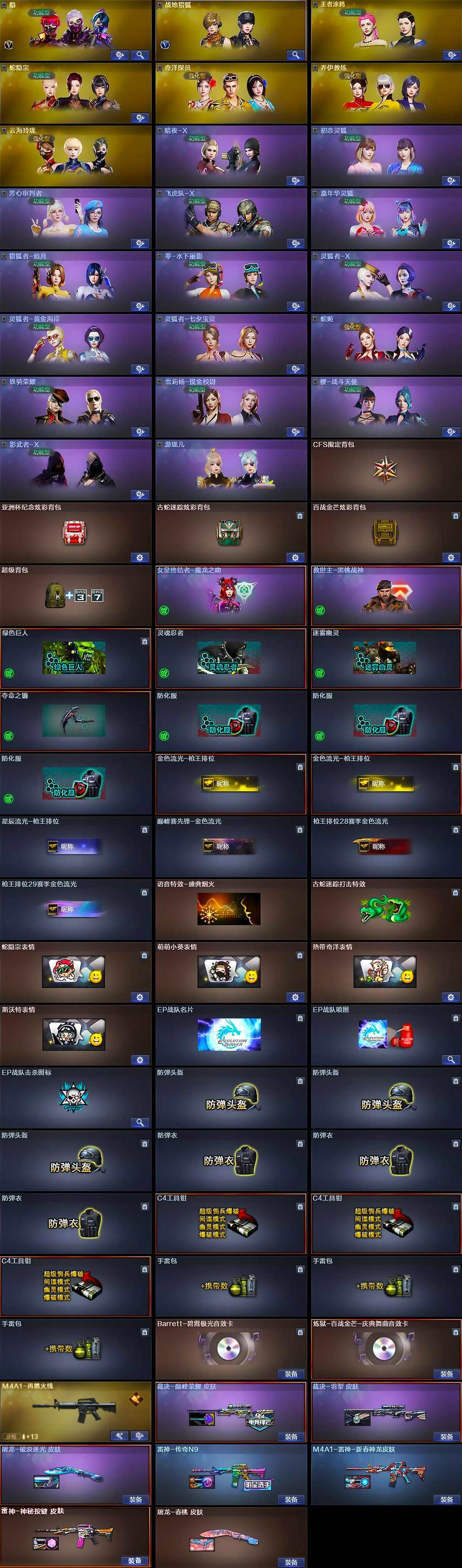 【道具】:CFS限定背包,亚洲杯纪念炫彩背包,古蛇迷踪炫彩背包,百战金芒炫彩背包,超级背包,哔哩哔哩名片,女皇终结者-魔龙之吻,救世主-黑桃战神,绿色巨人,灵魂忍者,迷雾幽灵,夺命之镰,防化服*3,金色流光-枪王排位*2,星辰流光-枪王排位,巅峰赛先锋-金色流光,枪王排位28赛季金色流光,枪王排位29赛季金色流光,语音特效-盛典烟火,古蛇迷踪打击特效,蛇隐宗表情,萌萌小葵表情,热带奇洋表情,斯沃特表情,EP战队名片,EP战队喷图,EP战队击杀图标,防弹头盔*3,防弹衣*3,C4工具钳*3,手雷包*3
