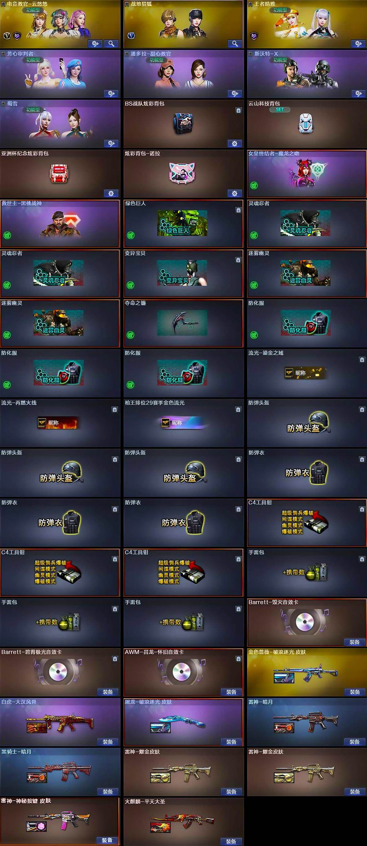 【道具】:BS战队炫彩背包,云山科技背包,亚洲杯纪念炫彩背包,炫彩背包-诺拉,女皇终结者-魔龙之吻,救世主-黑桃战神,绿色巨人,灵魂忍者*2,变异宝贝,迷雾幽灵*2,夺命之镰,防化服*3,流光-鎏金之域,流光-再燃火线,枪王排位29赛季金色流光,防弹头盔*3,防弹衣*3,C4工具钳*3,手雷包*3