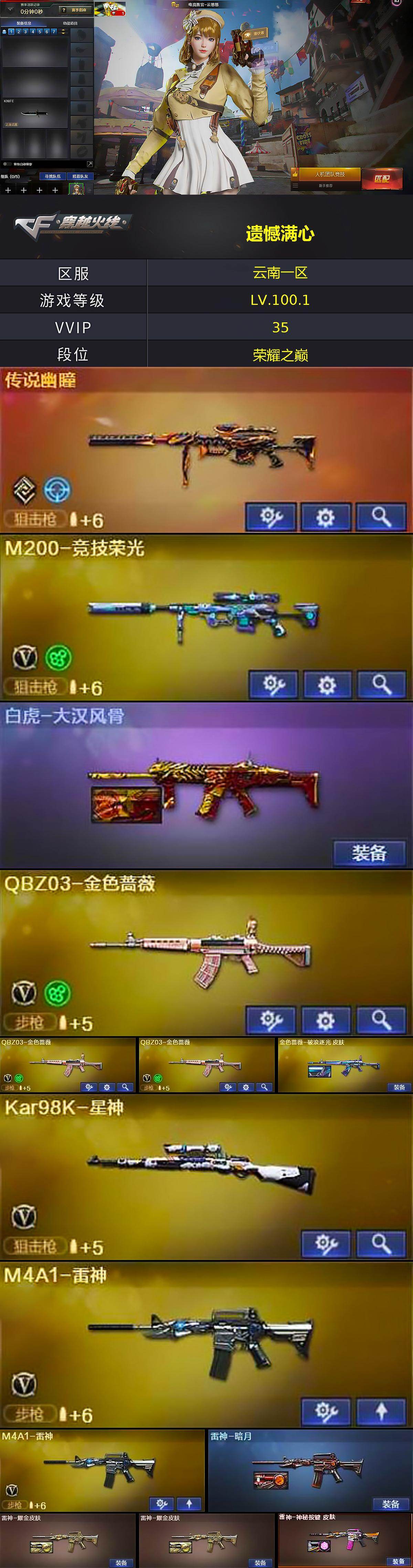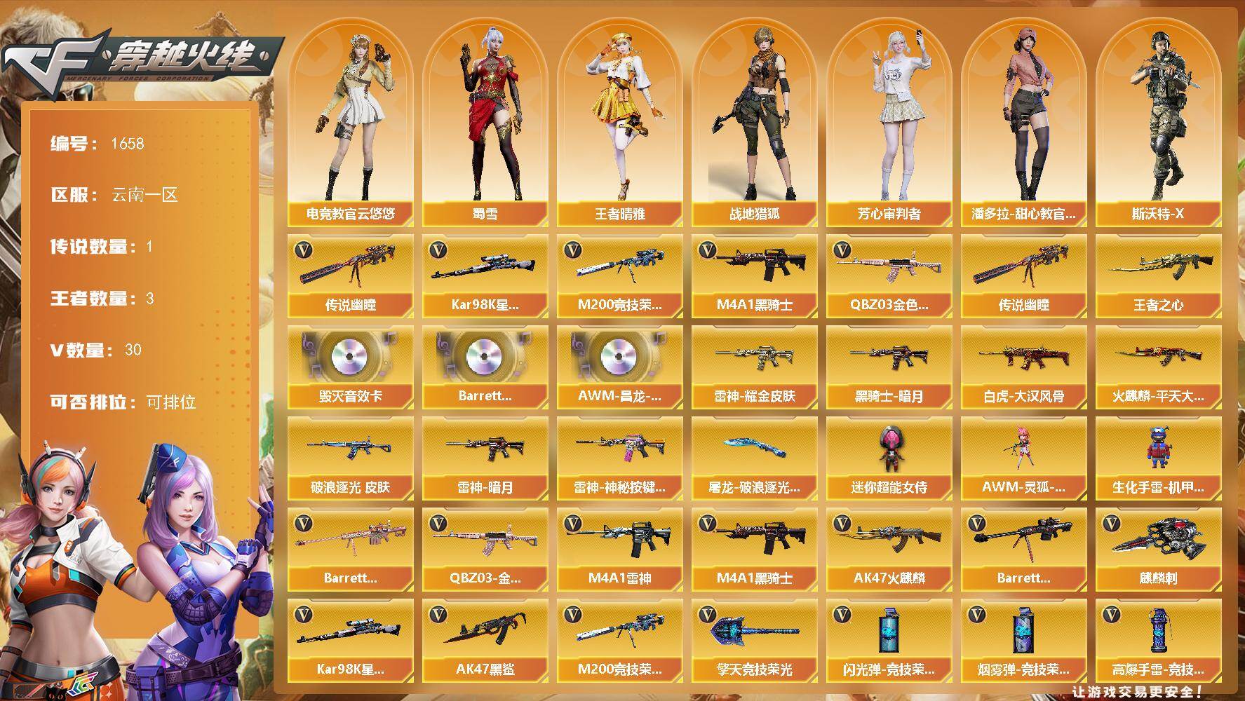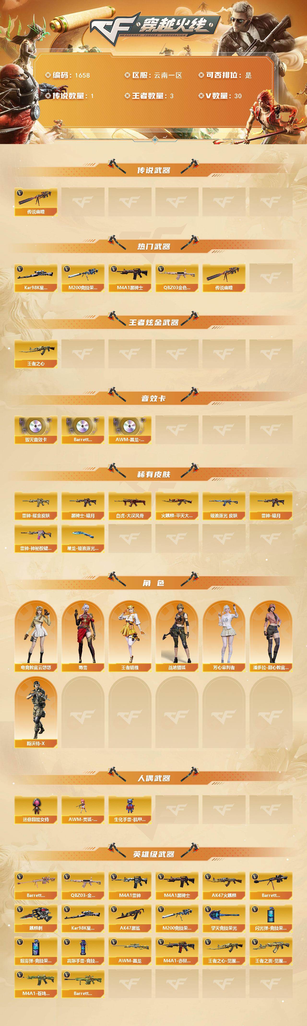 [15771167]云南一区-30V-3王者-0炫金 【传说武器】:传说幽瞳 【热门武器】:传说幽瞳,QBZ03-金色蔷薇*3,M200-竞技荣光,Kar98K-星神,M4A1-黑骑士 【王者炫金武器】:王者之心 【音效卡】:Barrett-毁灭音效卡,Barrett-碧霄极光音效卡,AWM-昌龙-怀旧音效卡 【皮肤】:白虎-大汉风骨,金色蔷薇-破浪逐光 皮肤,雷神-暗月,雷神-耀金皮肤*2,雷神-神秘按键 皮肤,火麒麟-平天大圣,黑骑士-暗月,屠龙-破浪逐光 皮肤 【角色】:电竞教官-云悠悠,战地猎狐,王者晴雅,芳心审判者,潘多拉-甜心教官,斯沃特-X,蜀雪 【人偶武器】:AWM-灵狐-15周年嘉年华,生化手雷-机甲核心,迷你超能女侍 【英雄级武器】:AK47-火麒麟,M4A1-雷神*2,M4A1-黑骑士,AK47-黑鲨,QBZ03-金色蔷薇*3,王者之心-觉醒版,王者之翼-觉醒版,Barrett-毁灭,Kar98K-星神,M200-竞技荣光,Barrett-金色蔷薇*2,麒麟刺,擎天-竞技荣光,高爆手雷-竞技荣光*3,闪光弹-竞技荣光*3,烟雾弹-竞技荣光*3,M4A1-赤狱骑士,M4A1-苍鸣雷神,AWM-昌龙,Barrett-碧霄极光 【道具】:BS战队炫彩背包,云山科技背包,亚洲杯纪念炫彩背包,炫彩背包-诺拉,女皇终结者-魔龙之吻,救世主-黑桃战神,绿色巨人,灵魂忍者*2,变异宝贝,迷雾幽灵*2,夺命之镰,防化服*3,流光-鎏金之域,流光-再燃火线,枪王排位29赛季金色流光,防弹头盔*3,防弹衣*3,C4工具钳*3,手雷包*3 【特殊枪械】:1黑骑士