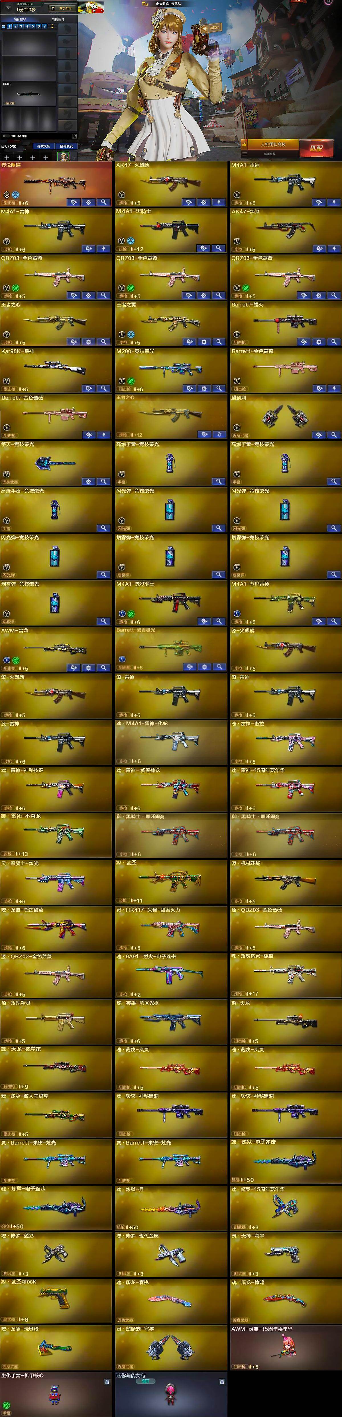 【英雄级武器】:AK47-火麒麟,M4A1-雷神*2,M4A1-黑骑士,AK47-黑鲨,QBZ03-金色蔷薇*3,王者之心-觉醒版,王者之翼-觉醒版,Barrett-毁灭,Kar98K-星神,M200-竞技荣光,Barrett-金色蔷薇*2,麒麟刺,擎天-竞技荣光,高爆手雷-竞技荣光*3,闪光弹-竞技荣光*3,烟雾弹-竞技荣光*3,M4A1-赤狱骑士,M4A1-苍鸣雷神,AWM-昌龙,Barrett-碧霄极光