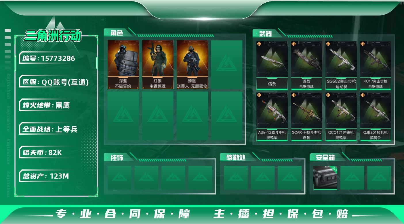 [15773286]【店主推荐捡漏号!可直接换绑】82k哈伏币-68m流动资产-60烽火等级-黑鹰-24战场等级-上等兵 【干员外观】:蜂医-送葬人·无题密令,深蓝-不破誓约,红狼-电锯惊魂 【近战皮肤】:近战-电锯惊魂,近战-信条,近战-黑鹰 【传说外观】:M4A1突击步枪-阿米娅,ASh-12战斗步枪-鹅鸭杀,M16A4突击步枪-狩猎时刻,SG552突击步枪-运动员,SCAR-H战斗步枪-启航,G3战斗步枪-狩猎时刻,CAR-15突击步枪-阿米娅,腾龙突击步枪-捞点薯条,KC17突击步枪-电锯惊魂,Vector冲锋枪-狩猎时刻,勇士冲锋枪-能天使-午夜邮差,QCQ171冲锋枪-鹅鸭杀,S12K霰弹枪-电锯惊魂,725双管霰弹枪-送葬人-无题密令,M250通用机枪-骑士之心,QJB201轻机枪-鹅鸭杀,M14射手步枪-电锯惊魂,AWM狙击步枪-捞点薯条,93R-捞点薯条,复合弓-黑·天际线 【史诗外观】:QBZ95-1突击步枪-曙光,ASh-12战斗步枪-无极限,M16A4突击步枪-竞赛选手,SCAR-H战斗步枪-囚徒,G3战斗步枪-流沙送葬,AS Val突击步枪-百步穿杨,腾龙突击步枪-无垢,K437突击步枪-守护者,MP5冲锋枪-战术竞备,MP5冲锋枪-竞技风,Vector冲锋枪-猎鳄行动,Vector冲锋枪-百步穿杨,SR-3M紧凑突击步枪-荒野求生,SR-3M紧凑突击步枪-战术竞备,勇士冲锋枪-工业狂潮,MP7冲锋枪-无垢,MP7冲锋枪-守护者,PKM通用机枪-荒野求生,Mini-14射手步枪-守护者,SVD狙击步枪-荒野求生,PSG-1射手步枪-无垢,SV-98狙击步枪-林中猎手,SV-98狙击步枪-囚徒,SV-98狙击步枪-猎鳄行动,M700狙击步枪-竞技风,M700狙击步枪-百步穿杨,AWM狙击步枪-无极限,AWM狙击步枪-流沙送葬,复合弓-守护者 【稀有外观】:PTR-32突击步枪-花岗岩,SR-3M紧凑突击步枪-花岗岩,M1014霰弹枪-花岗岩,AS Val突击步枪-地平线*2,M870霰弹枪-地平线,R93狙击步枪-地平线,M4A1突击步枪-繁盛,AKM突击步枪-战术演练,AKM突击步枪-肃杀,QBZ95-1突击步枪-公平竞技,AKS-74U突击步枪-精英联盟,ASh-12战斗步枪-繁盛,K416突击步枪-虎啸,M7战斗步枪-捣蛋鬼,SCAR-H战斗步枪-荣耀列