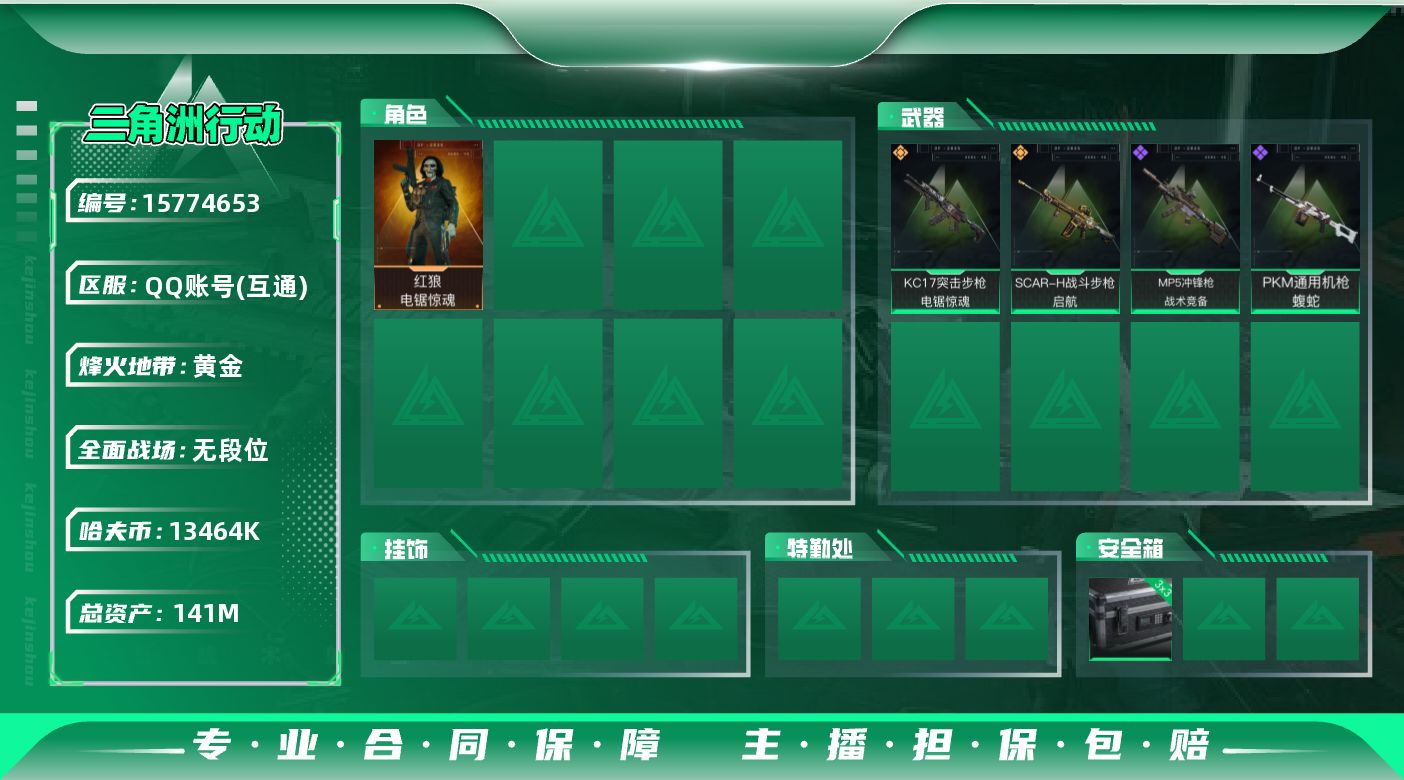 [15774653]13464k哈伏币-123m流动资产-60烽火等级-黄金-1战场等级-无军衔 【干员外观】:红狼-电锯惊魂 【近战皮肤】:近战-黑鹰 【传说外观】:SCAR-H战斗步枪-启航,KC17突击步枪-电锯惊魂 【史诗外观】:MP5冲锋枪-战术竞备,PKM通用机枪-蝮蛇 【稀有外观】:M700狙击步枪-旧梦,AKM突击步枪-肃杀,M7战斗步枪-捣蛋鬼,腾龙突击步枪-冰天雪地,MP5冲锋枪-哈夫克卫队,P90冲锋枪-黄昏,P90冲锋枪-捣蛋鬼,UZI冲锋枪-亚特兰蒂斯,SMG-45-行动开启,SMG-45冲锋枪-幻影结构,勇士冲锋枪-前沿科技,Mini-14射手步枪-荣耀列队,G18-星链科技,G18-哈夫克航天 【普通外观】:M4A1突击步枪-粉色涂装,M4A1突击步枪-海色,QBZ95-1突击步枪-高雅黑,QBZ191突击步枪-三角洲力量,K416突击步枪-高雅黑,M16A4突击步枪-高雅黑,SG552突击步枪-浅蓝涂装,SG552突击步枪-海浪,MP5冲锋枪-黄蜂,M1014霰弹枪-高雅黑,M249轻机枪-黄蜂,M250通用机枪-条纹,SR-25射手步枪-黄蜂,SV-98狙击步枪-红色涂装,QSZ92G-条纹,沙漠之鹰-海浪,沙漠之鹰-高雅黑 【载具外观】:轮式突击炮-荣耀 【军牌】:军牌-修整,军牌-神秘艺术,军牌-信誉优秀 【挂饰】:挂饰-维什戴尔,挂饰-诡影狙击兵,挂饰-崩岩重炮*3,挂饰-暗行哨兵,挂饰-启程 【热门藏品】:非洲之心