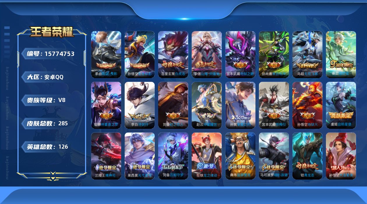 [15774753]安卓Q-V8-永恒钻石V段位-123英雄-267皮肤-2典藏-0珍品无双-0无双-0珍品传说-14传说-73史诗 【荣耀典藏】:孙悟空全息碎影,李白鸣剑曳影 【传说皮肤】:桑启鸣野蒿,宫本武藏惊梅引,李信山海炽霜斩,李白诗剑行,马超无双飞将,孙策挚爱之约,赵云淬星耀世,虞姬启明星使,刘备时之恋人,百里玄策白虎志,貂蝉仲夏夜之梦,孙尚香末日机甲,宫本武藏地狱之眼,孙悟空地狱火 【限定皮肤】:白起狰,狄仁杰阴阳师,虞姬凯尔特女王,赵云皇家上将,嬴政白昼王子,鲁班七号狮舞东方,庄周高山流水,钟无艳王者之锤,钟无艳超时空战士,孙膑妖精王,扁鹊炼金王,白起夜都怪侠,芈月重明,吕布猎兽之王,周瑜赤莲之焰,元歌云间偶戏,元歌无心,夏侯惇朔风刀,甄姬游园惊梦,甄姬落雪兰心,曹操烛龙,典韦穷奇,典韦蓝屏警告,马可波罗暗影游猎,狄仁杰魔术师,狄仁杰万华元夜,达摩沙漠行僧,项羽海滩派对,老夫子醍醐杖,关羽冰锋战神,程咬金演武夺筹,露娜一生所爱,兰陵王驯魔猎人,兰陵王金庭之子,花木兰青春决赛季,花木兰默契交锋,亚瑟潮玩骑士王,孙悟空美猴王,孙悟空大圣娶亲,牛魔御旌,刘备百相守梦,李元芳云中旅人,虞姬启明星使,钟馗神迹守卫,钟馗驱傩正仪,杨玉环遇见飞天,女娲朔望之晖,雅典娜单词大作战,雅典娜黎明之约,蔡文姬繁星吟游,太乙真人饕餮,太乙真人华丽摇滚,东皇太一逐梦之光,鬼谷子原初探秘者,鬼谷子五谷丰年,铠青龙志,苏烈千军破阵,百里玄策白虎志,百里玄策原初追逐者,弈星混沌棋,梦奇顽趣,沈梦溪大漠名商,明世隐疑决卦,明世隐吟游魔法,裴擒虎天狼狩猎者,裴擒虎李小龙,裴擒虎擒涛扼浪,狂铁御狮,米莱狄御霄,云中君纤云弄巧,李信山海炽霜斩,盾山御銮,孙策挚爱之约,猪八戒西部大镖客,猪八戒猪悟能,上官婉儿梁祝,蒙犽狂想玩偶喵,鲁班大师探海日志,桑启海盐诗旅,艾琳女武神,阿古朵江河有灵,张良古海寻踪,鬼谷子天穹祈灯 【年限皮肤】:百里玄策白虎志,铠青龙志,孙悟空美猴王,李信山海炽霜斩 【赛季限定】:孙膑妖精王,扁鹊炼金王,白起狰,芈月重明,夏侯惇朔风刀,曹操烛龙,典韦穷奇,狄仁杰万华元夜,达摩沙漠行僧,老夫子醍醐杖,程咬金演武夺筹,兰陵王金庭之子,张良古海寻踪,牛魔御旌,李元芳云中旅人,虞姬凯尔特女王,钟馗驱傩正仪,雅典娜黎明之约,太乙真人饕餮,鬼谷子原初探秘者,苏烈千军破阵,百里玄策原初追逐者,弈星混沌棋,