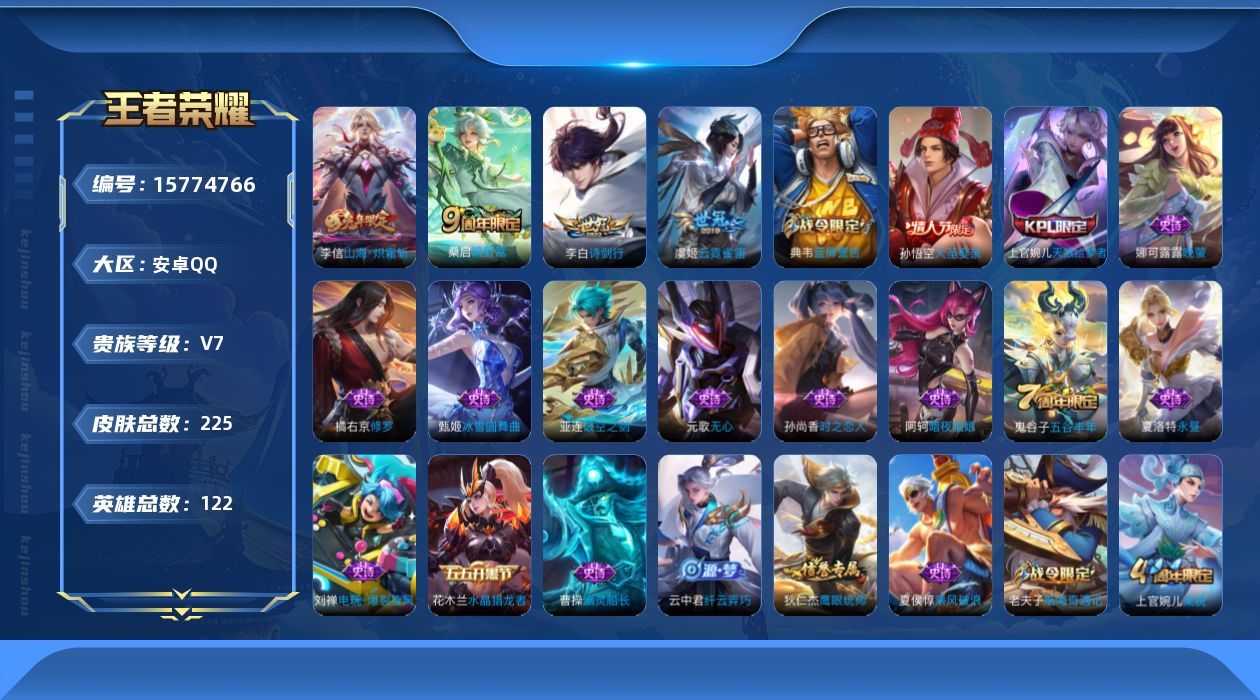 [15774766]安卓Q-V7-至尊星耀IV段位-122英雄-225皮肤-0典藏-0珍品无双-0无双-0珍品传说-4传说-50史诗