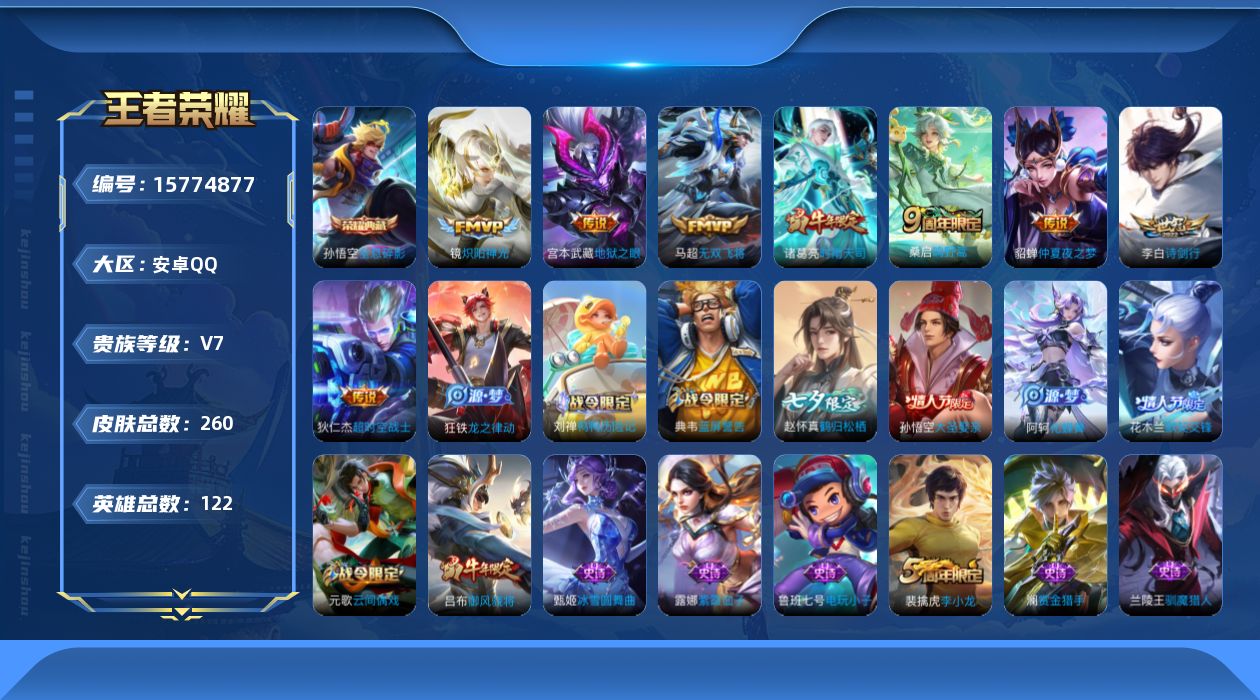 [15774877]安卓Q-V7-最强王者段位-122英雄-260皮肤-1典藏-0珍品无双-0无双-0珍品传说-8传说-68史诗