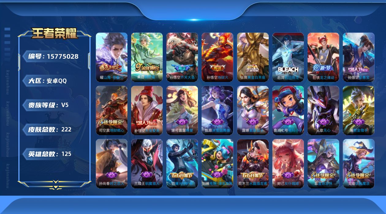 [15775028]安卓Q-V5-永恒钻石I段位-124英雄-222皮肤-0典藏-0珍品无双-0无双-0珍品传说-5传说-44史诗 【传说皮肤】:桑启鸣野蒿,孙悟空齐天大圣,曜山海苍雷引,张良黄金白羊座,孙悟空地狱火 【限定皮肤】:姜子牙天穹之誓,杨戬破阵退雄兵,狄仁杰阴阳师,赵云皇家上将,嬴政白昼王子,孙尚香蔷薇恋人,庄周高山流水,阿轲迷踪丽影,扁鹊奇幻香踪,芈月重明,吕布猎兽之王,周瑜赤莲之焰,元歌无心,夏侯惇朔风刀,典韦穷奇,狄仁杰魔术师,项羽海滩派对,老夫子醍醐杖,刘邦夺宝奇兵,兰陵王驯魔猎人,孙悟空美猴王,孙悟空至尊宝,孙悟空大圣娶亲,孙悟空齐天大圣,牛魔御旌,李元芳云中旅人,杨戬潮玩骑兵,雅典娜单词大作战,弈星混沌棋,沈梦溪大漠名商,明世隐疑决卦,裴擒虎擒涛扼浪,狂铁御狮,米莱狄御霄,盾山御銮,上官婉儿梁祝,嫦娥暖冬兔眠,曜山海苍雷引,西施玲珑珍味,鲁班大师探海日志,桑启海盐诗旅,暃星界游侠,戈娅驭风魔法,艾琳流音漫舞,司空震地狱燃心,阿古朵江河有灵,张良古海寻踪,鬼谷子天穹祈灯,沈梦溪龙舞盛年,刘邦剑破天穹,刘备异域游侠,周瑜熔金海岸 【年限皮肤】:孙悟空美猴王,曜山海苍雷引 【赛季限定】:芈月重明,夏侯惇朔风刀,典韦穷奇,老夫子醍醐杖,张良古海寻踪,牛魔御旌,李元芳云中旅人,弈星混沌棋,沈梦溪大漠名商,明世隐疑决卦,裴擒虎擒涛扼浪,狂铁御狮,米莱狄御霄,盾山御銮,鲁班大师探海日志,桑启海盐诗旅,鬼谷子天穹祈灯,刘邦剑破天穹,姜子牙天穹之誓 【战令限定】:嬴政白昼王子,阿轲迷踪丽影,扁鹊奇幻香踪,吕布猎兽之王,周瑜赤莲之焰,刘邦夺宝奇兵,兰陵王驯魔猎人,艾琳流音漫舞,杨戬潮玩骑兵,雅典娜单词大作战,嫦娥暖冬兔眠,西施玲珑珍味,司空震地狱燃心,暃星界游侠,戈娅驭风魔法 【史诗皮肤】:鲁班七号电玩小子,露娜紫霞仙子,赵云皇家上将,甄姬冰雪圆舞曲,狄仁杰魔术师,宫本武藏鬼剑武藏,孙尚香蔷薇恋人,孙尚香水果甜心,嬴政摇滚巨星,妲己魅力维加斯,妲己女仆咖啡,墨子金属风暴,吕布圣诞狂欢,李白千年之狐,韩信白龙吟,孙悟空至尊宝,花木兰水晶猎龙者,刘邦德古拉伯爵,诸葛亮黄金分割率,安琪拉心灵骇客,百里守约特工魅影,铠曙光守护者,阿轲节奏热浪,嬴政白昼王子,孙策猫狗日记,孙悟空大圣娶亲,伽罗箭羽风息,狄仁杰鹰眼统帅,兰陵王驯魔猎人,上官婉儿梁祝,娜可露露晚萤,阿轲迷踪丽影,孙尚香时之恋人