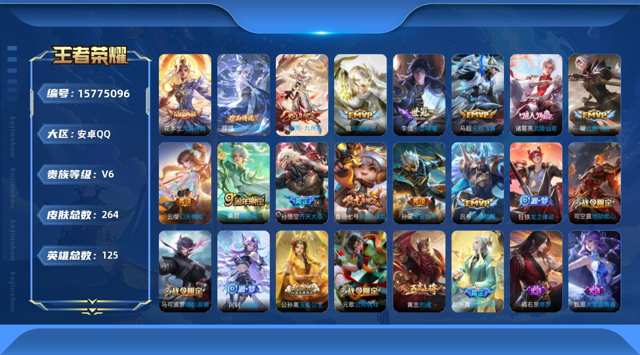 [15775096]安卓Q-V6-永恒钻石III段位-124英雄-262皮肤-1典藏-0珍品无双-0无双-1珍品传说-12传说-60史诗