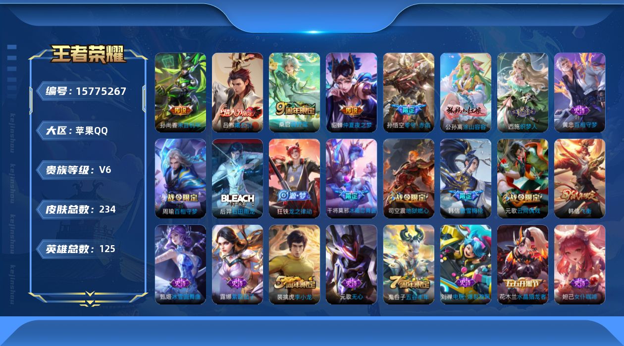 [15775267]苹果Q-V6-永恒钻石III段位-125英雄-234皮肤-0典藏-0珍品无双-0无双-0珍品传说-6传说-59史诗