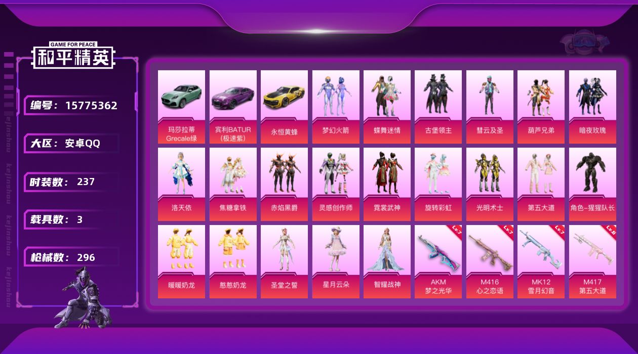[15775362]安卓 手Q-20粉装-6特效枪-3载具-4粉色飞行器-109096热力值-10王牌印记-237套装-296枪皮