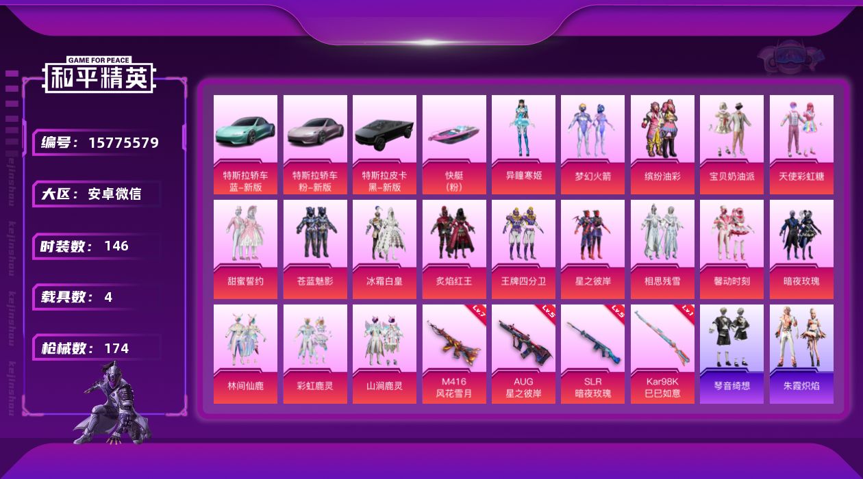 [15775579]【特价出售/店主推荐】 安卓 微信-17粉装-4特效枪-4载具-6粉色飞行器-71994热力值-8王牌印记-146套装-174枪皮 【热门品类】:粉装-梦幻火箭,粉装-缤纷油彩 【粉色套装】:粉装-宝贝奶油派,粉装-天使彩虹糖,粉装-梦幻火箭,粉装-缤纷油彩,粉装-甜蜜誓约,粉装-苍蓝魅影,粉装-冰霜白皇,粉装-炙焰红王,粉装-王牌四分卫,粉装-星之彼岸,粉装-相思残雪,粉装-馨动时刻,粉装-暗夜玫瑰,粉装-林间仙鹿,粉装-彩虹鹿灵,粉装-山涧鹿灵,角色-异瞳寒姬 【粉色枪皮等级】:M416-风花雪月(七级),AUG-星之彼岸(五级),Kar98K-巳巳如意(一级),SLR-暗夜玫瑰(五级) 【粉色载具】:特斯拉Roadster(水滴蓝),特斯拉Roadster(沁心粉),特斯拉Cybertruck(极昼黑),空客H135-蔚蓝之翼,快艇-塞莎KL27(霓虹粉) 【粉色枪皮】:M416-风花雪月,AUG-星之彼岸,Kar98K-巳巳如意,SLR-暗夜玫瑰 【粉色飞行器】:梦幻火箭飞行器,甜蜜誓约飞行器,激战未来飞行器,绮梦青鸾飞行器,星之彼岸飞行器 【粉色降落伞】:甜心宝贝降落伞,梦幻火箭降落伞,甜蜜誓约降落伞,香水柠檬降落伞,暗翼战神降落伞,王牌四分卫降落伞,星之彼岸降落伞,相思残雪降落伞,怪笑疯兔降落伞,葫芦兄弟降落伞,暗夜玫瑰降落伞,林间仙鹿降落伞,海渊国主降落伞,蓝莓炮弹降落伞,炫光之旅降落伞,冷漠罗丽降落伞,炫彩糖果降落伞 【稀有套装】:套装-糖糖葫芦,套装-青团波波,套装-棉花软糖,角色-都市丽猫,套装-燕燕于飞,套装-鱼渊荷华,套装-霓虹热舞,套装-彩虹兔,套装-云朵鹅,套装-雪绒豹,套装-朱霞炽焰,套装-凌霄紫焰,套装-琴音绮想,套装-炫彩糖果 【稀有枪皮】:AKM-彩虹符号,AKM-星之彼岸,AKM-缤纷海域,AKM-萌趣颜团子,AKM-虎虎生威,AKM-龙的传人,M16A4-幻世战舞者,M16A4-甜心亚梦,SCAR-L-夏日绵绵冰,SCAR-L-暗夜玫瑰,SCAR-L-炫彩节奏,SCAR-L-玉兔迎春,SCAR-L-王牌四分卫,SCAR-L-甜蜜誓约,SCAR-L-碧影闪光,GROZA-异彩先驱,GROZA-彩虹符号,GROZA-林间仙鹿,GROZA-治愈之星,AUG-青春冒险家,QBZ-彩虹符号,QBZ-洛神天依,QBZ-电玩视界,QBZ-