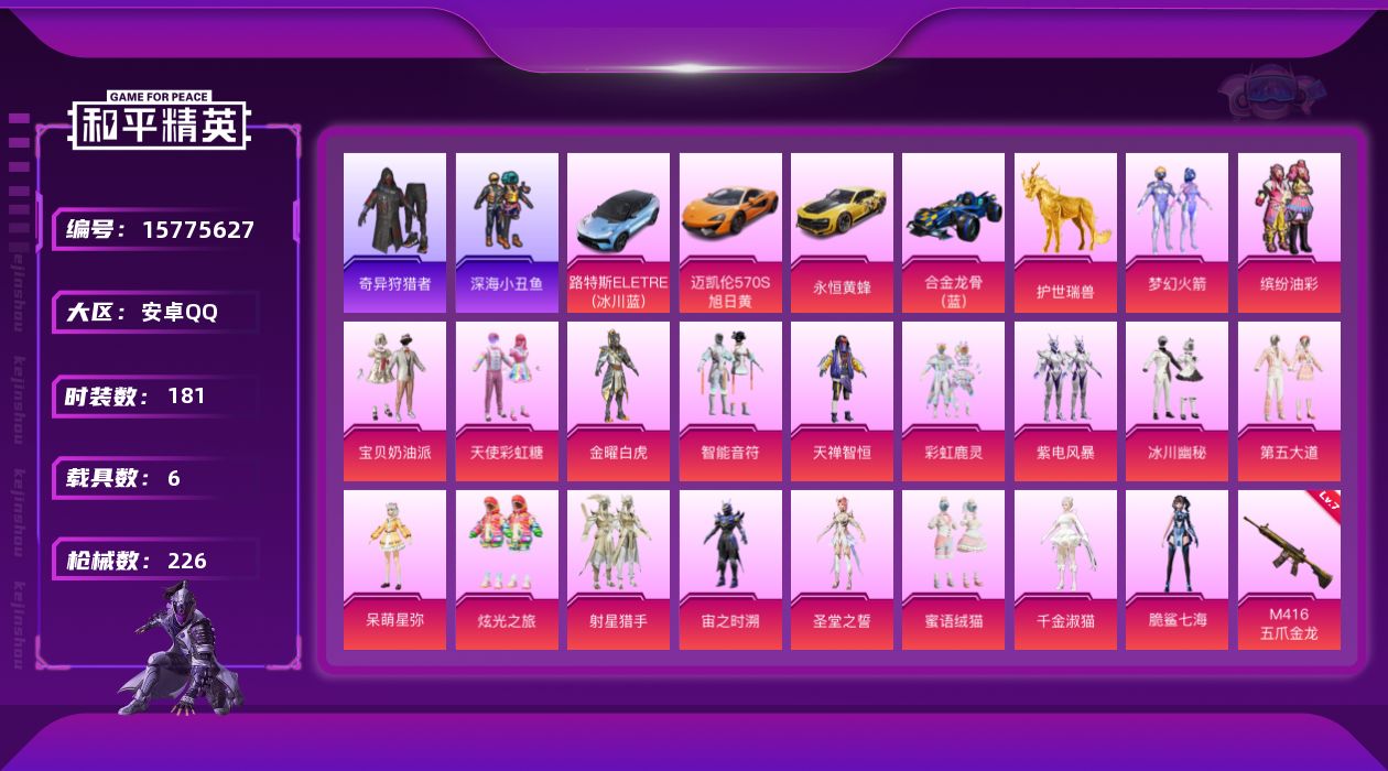 [15775627]安卓 手Q-19粉装-6特效枪-6载具-5粉色飞行器-82757热力值-11王牌印记-181套装-226枪皮 【热门品类】:粉装-梦幻火箭,粉装-缤纷油彩,套装-浪漫天命,套装-深海小丑鱼,套装-奇异狩猎者,角色-军刀雅典娜,套装-龟仙人,套装-暗影哥特 【粉色载具】:路特斯ELETRE(冰川蓝),迈凯伦570S(旭日黄),永恒黄蜂,合金龙骨(蓝),护世瑞兽 【粉色套装】:粉装-宝贝奶油派,粉装-天使彩虹糖,粉装-金曜白虎,粉装-梦幻火箭,粉装-智能音符,粉装-缤纷油彩,粉装-天禅智恒,粉装-彩虹鹿灵,粉装-紫电风暴,粉装-冰川幽秘,粉装-第五大道,角色-呆萌星弥,粉装-炫光之旅,粉装-射星猎手,角色-宙之时溯,角色-圣堂之誓,粉装-蜜语绒猫,角色-千金淑猫,角色-脆鲨七海 【粉色枪皮等级】:SCAR-L-金蛇镇世(三级),M416-五爪金龙(七级),Kar98K-巳巳如意(五级),DP-28-千金淑猫(五级),DP-28-豹影疾电(五级),MG3-洛神天依(六级) 【粉色枪皮】:SCAR-L-金蛇镇世,M416-五爪金龙,Kar98K-巳巳如意,DP-28-千金淑猫,DP-28-豹影疾电,MG3-洛神天依 【粉色飞行器】:酣梦熊熊飞行器,青春物语飞行器,太空嘟嘟飞行器,万象金身飞行器 【粉色降落伞】:甜心宝贝降落伞,梦幻火箭降落伞,星之信仰降落伞,童趣迷兔降落伞,梦之光华降落伞,碧影闪光降落伞,恐龙拽拽降落伞,筑梦精灵降落伞,环太平洋降落伞,绒雪飘舞降落伞,纯梦嫁纱降落伞,白勺歌姬降落伞,未来歌姬降落伞,闲梦青缨降落伞,炫光之旅降落伞,万古烈焰降落伞,莲影清波降落伞,圣堂之誓降落伞,小叽联名款降落伞,蜜语绒猫降落伞,墨龙九天降落伞,千金淑猫降落伞,脆鲨七海降落伞,月影灵韵降落伞,金蛇镇世降落伞,雪月幻音降落伞,幻彩电音降落伞 【稀有套装】:套装-龟仙人,套装-航行童话,套装-绒宝小鹅,套装-巳巳如意,套装-糖糖葫芦,套装-青团波波,套装-棉花软糖,角色-都市丽猫,角色-摩登魅猫,角色-临安公主,角色-俏兔智灵,角色-光矢逐梦,套装-燕燕于飞,套装-鱼渊荷华,套装-晶灵使者,套装-晶辉守护,套装-风舞幻音,套装-紫幽梦,套装-蓝冰羽,套装-云朵鹅,套装-雪绒豹,套装-朱霞炽焰,套装-凌霄紫焰,套装-擎苍青焰 【稀有枪皮】:AKM-2P战斗服款,AKM-奇异狩猎者,